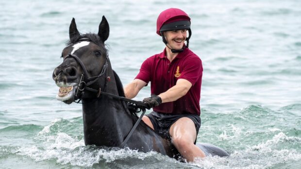 A ‘special moment’ as cavalry horse who galloped loose through London joins colleagues for a beach trip – and swim