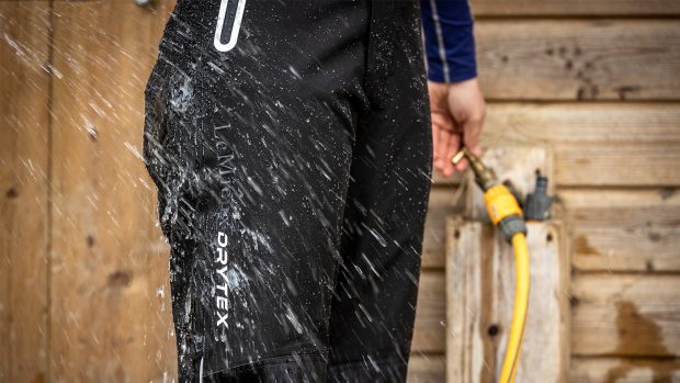 This robe has similar details to others that came up top in this test, including side zips, riding vent, adjustable waist cinch, lined pockets and leg straps – it’s only the waterproof rating is lower than the others. I have tested this out in wet and windy conditions and it has never leaked but I found the outer material wetted out more quickly than the LeMieux All Elements robe, for example, when out for long periods.