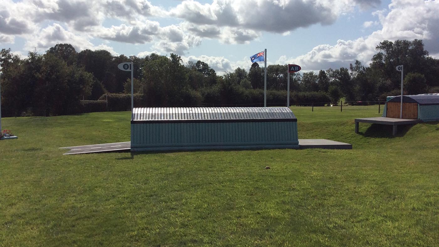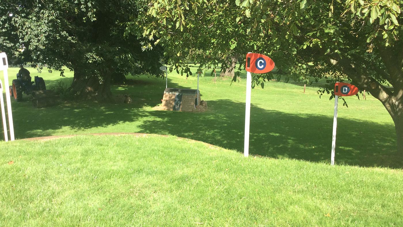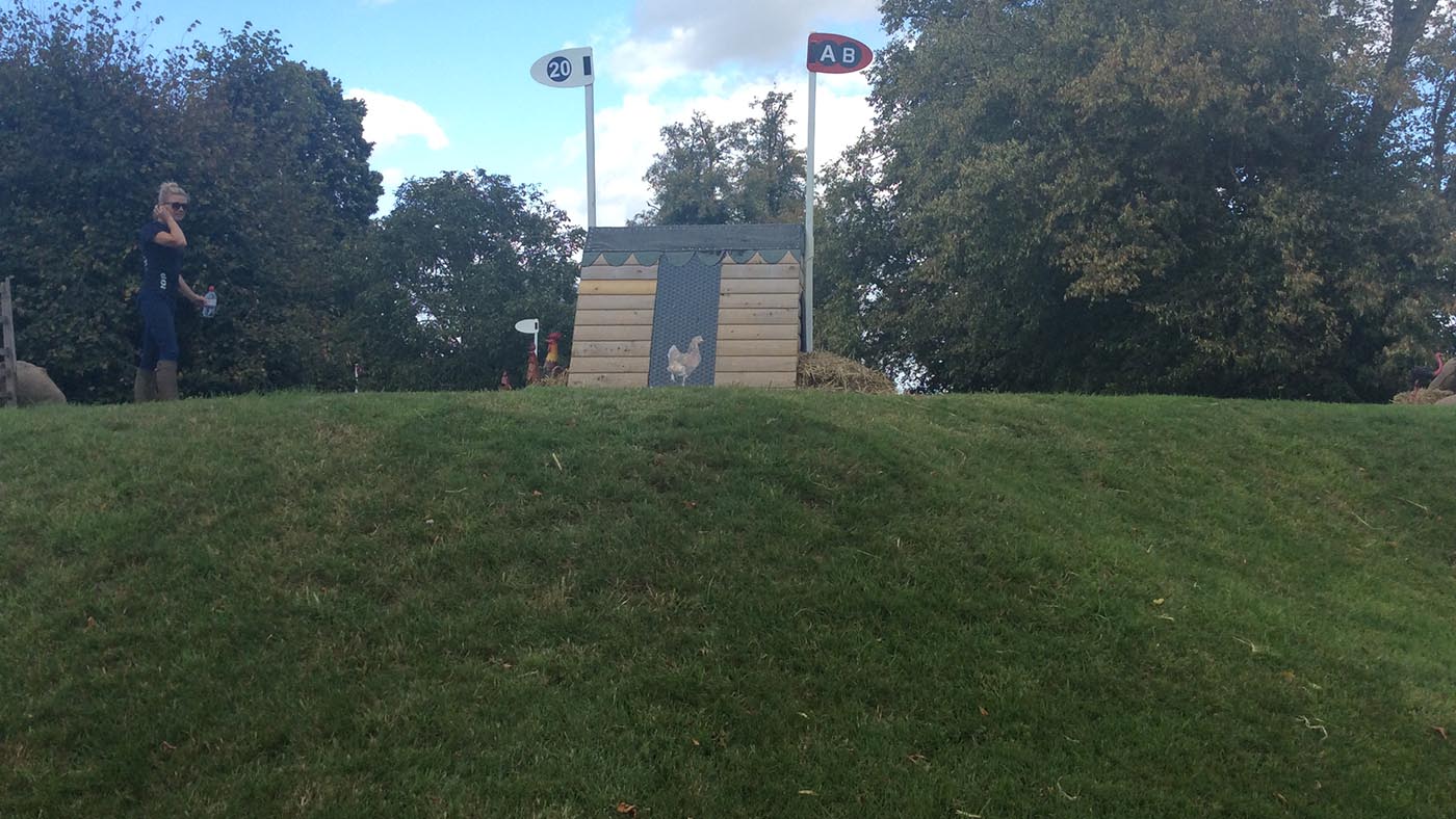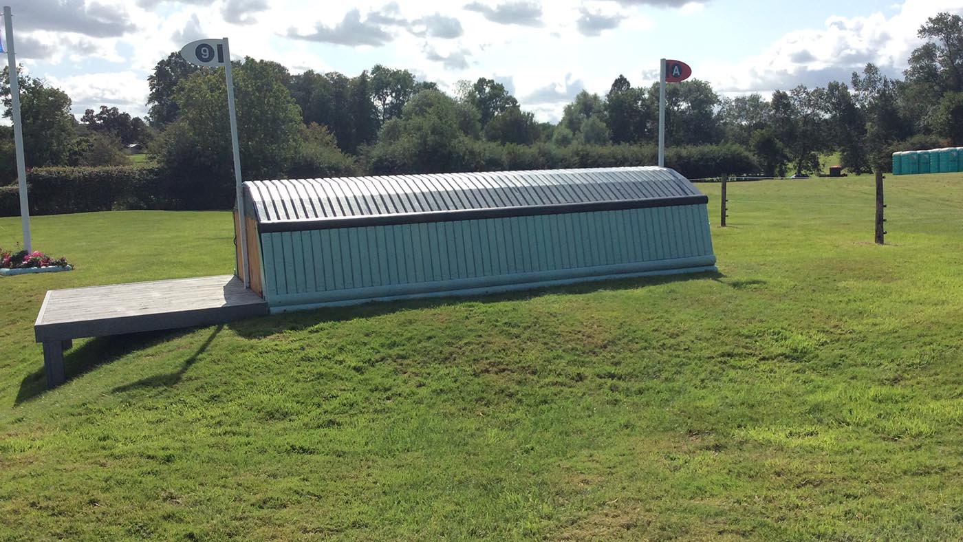 Fence 9a and b: Flight Hangar — option of a rolltop with a drop on landing or a rolltop on flatter ground followed by a hedge