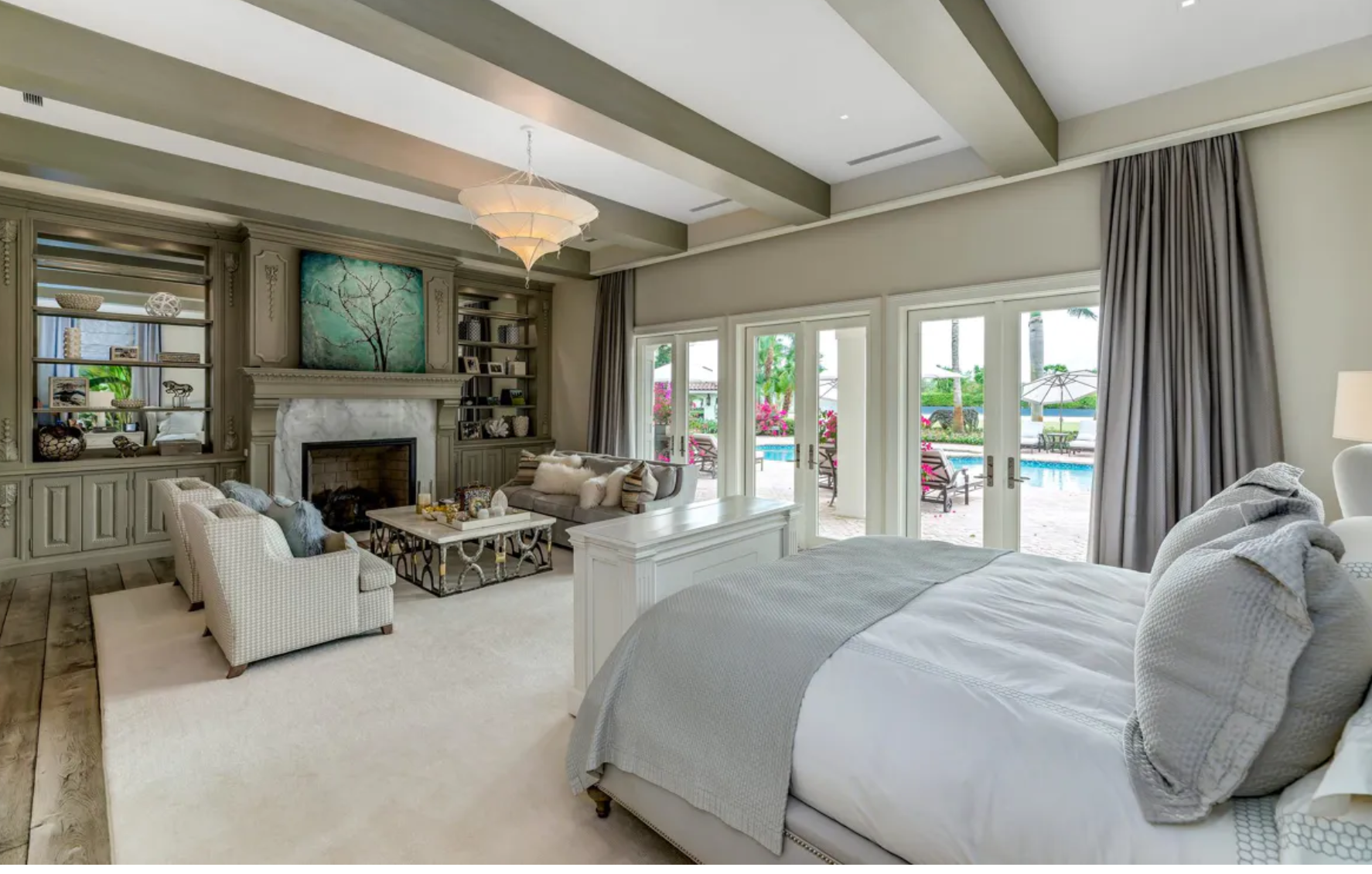 The master features a sitting area with fireplace overlooking the pool area, his and hers walk in wardrobes.