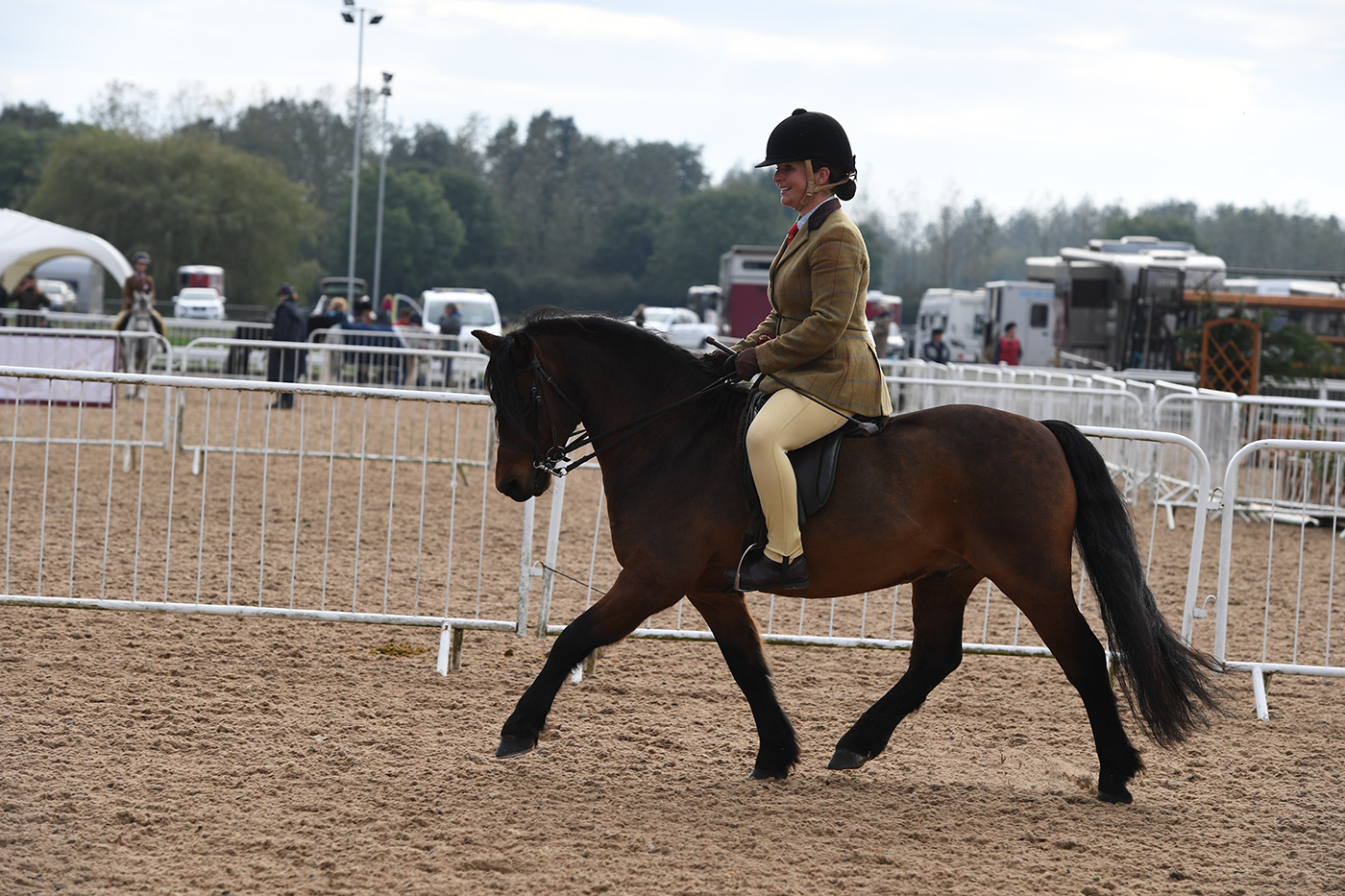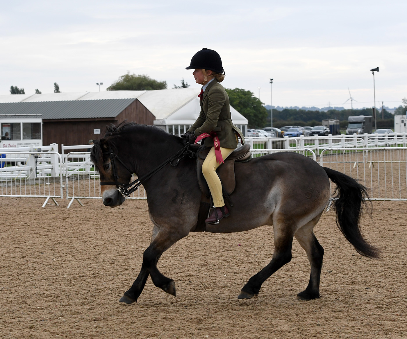 Christine Phillips’ Exmoor gelding canters to the Exmoor breed class with Alice Tomlinson at the helm.