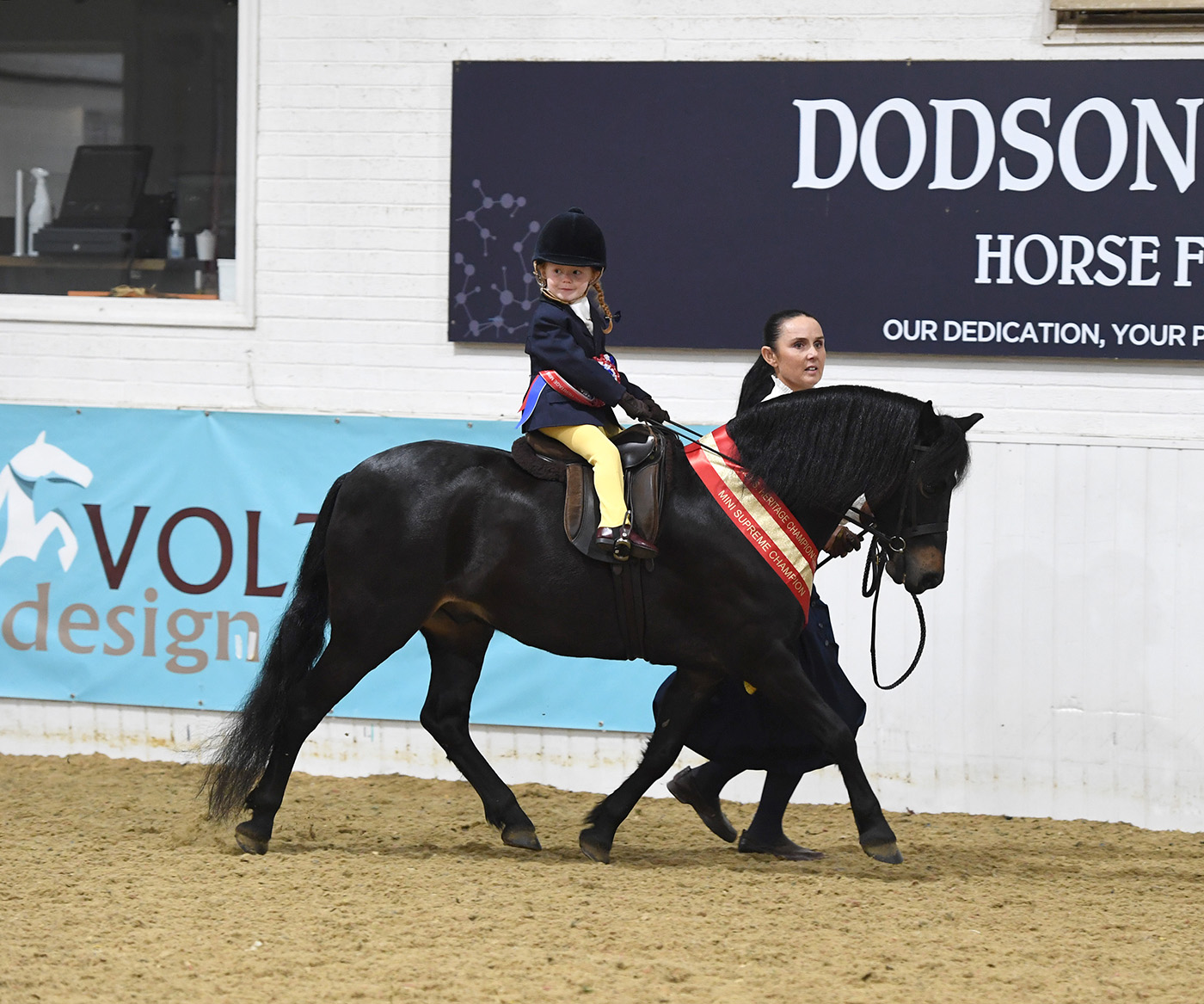 Eva Talbot is in the saddle of the Dartmoor gelding who stood supreme mini champion on Sunday.