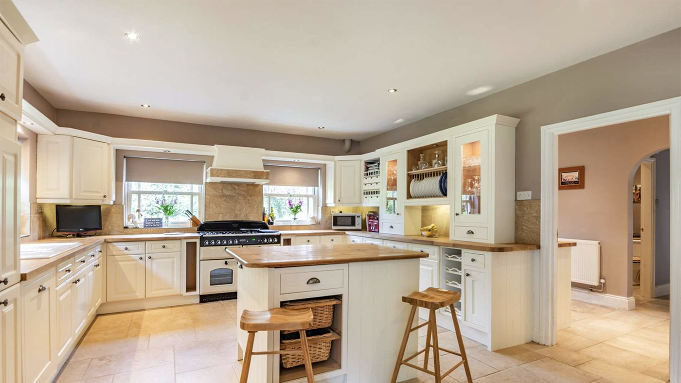 The country-style kitchen boasts a large island, fitted units and tiled flooring with doors leading out to a patio area. Beyond the kitchen is a second kitchen and utility area with fitted units and two Belfast sinks which leads through to the new extension.