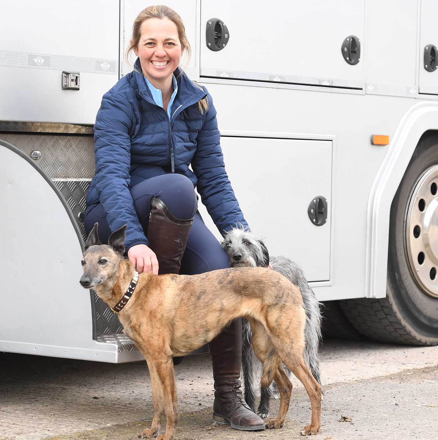 Kitty with her two Bedlington/whippets, who watch her every move around the yard. Once she’s finished riding, she takes them for a walk around the farm.
