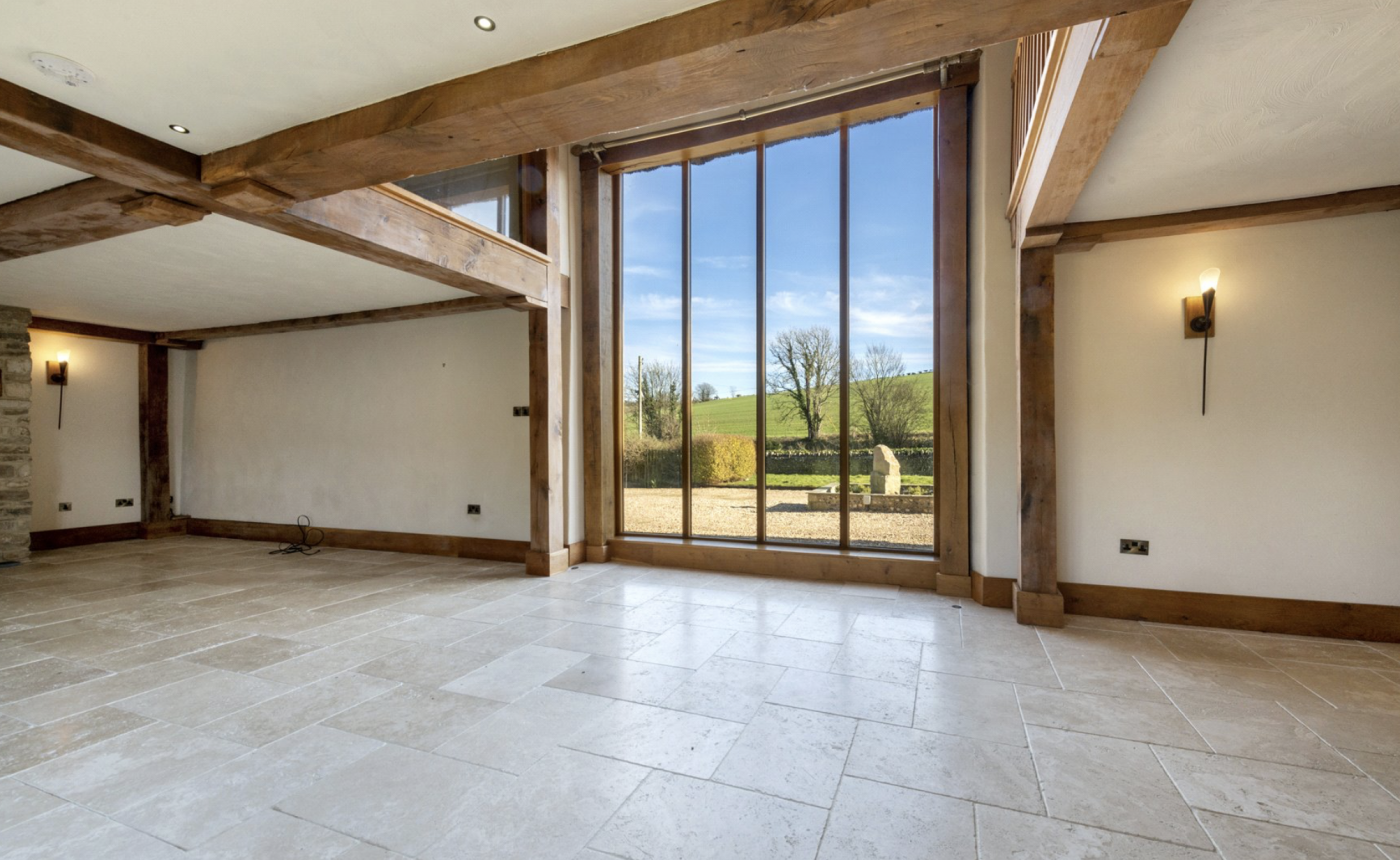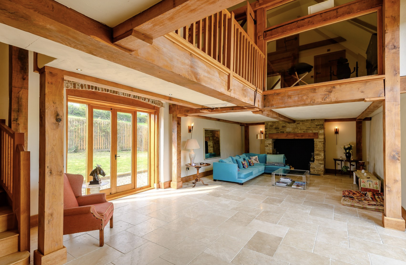 A galleried drawing room has floor-to-ceiling windows that replaced the original barn doors. With a wood-burner set within an inglenook fireplace, the additional sitting room (originally the farmhouse kitchen) provides a snug-type room.