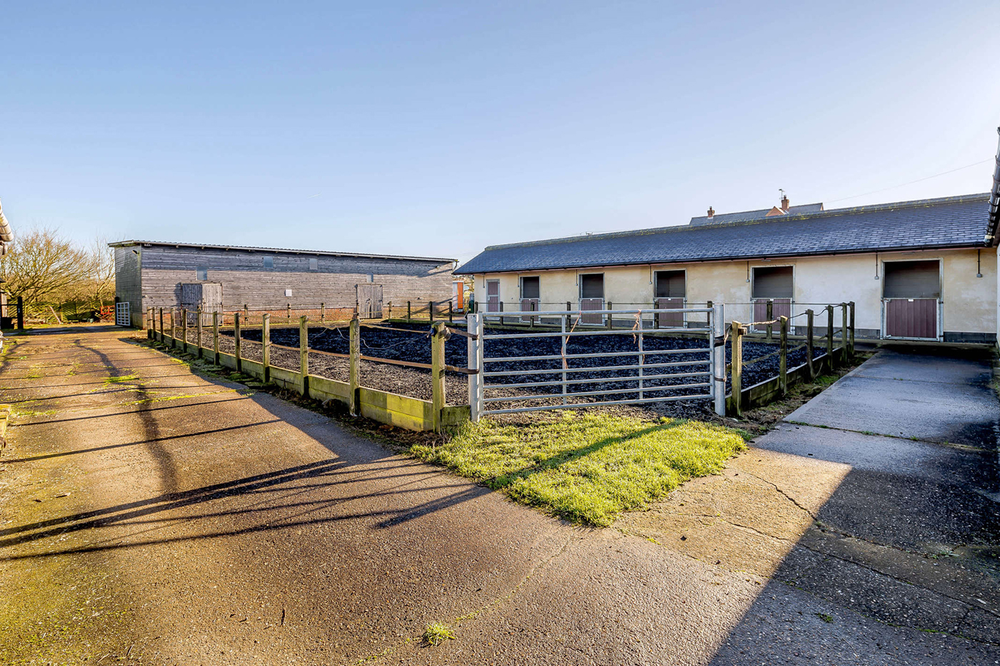 There is an L-shaped block of stables with concrete yard containing five loose boxes, wash bay, large tack/day room, large feed room, laundry room and W/C. The yard is centred around an all-weather turnout pen. The hay and storage barn is accessible from the yard and this also enjoys full vehicular access with covered parking for a lorry or trailer.
