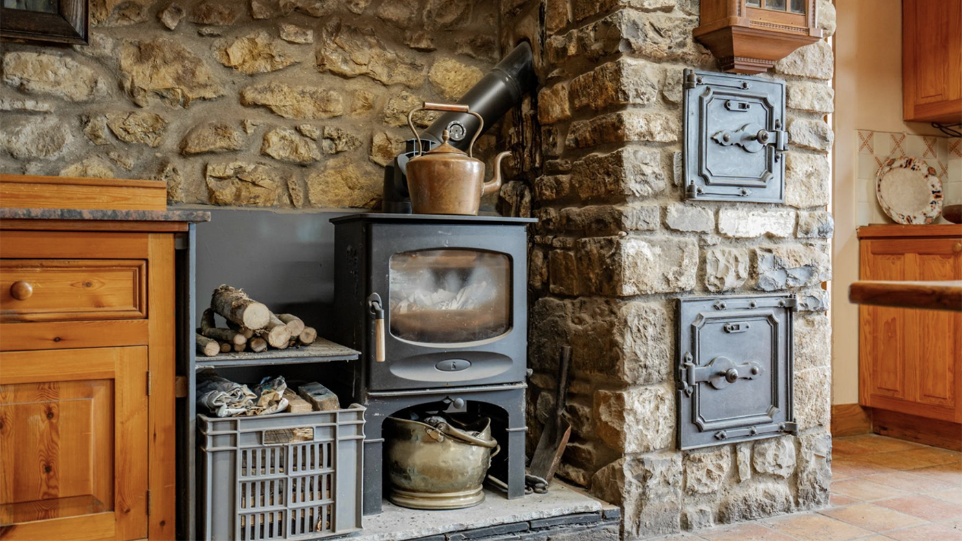 The kitchen can be found at the heart of the main home. The large room boasts a wood-burner and a feature oven as well as exposed walls/beams.
