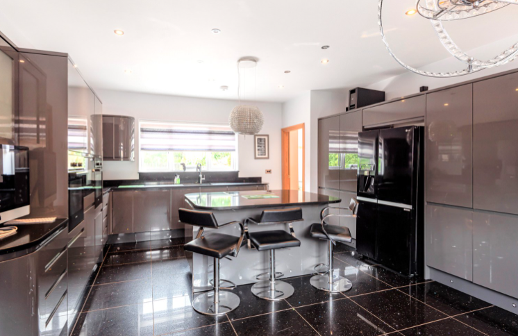 The quartz flooring continues into a dining/kitchen room with grey high gloss units, quartz worktops and a range of appliances and Quooker instant boiling water tap.