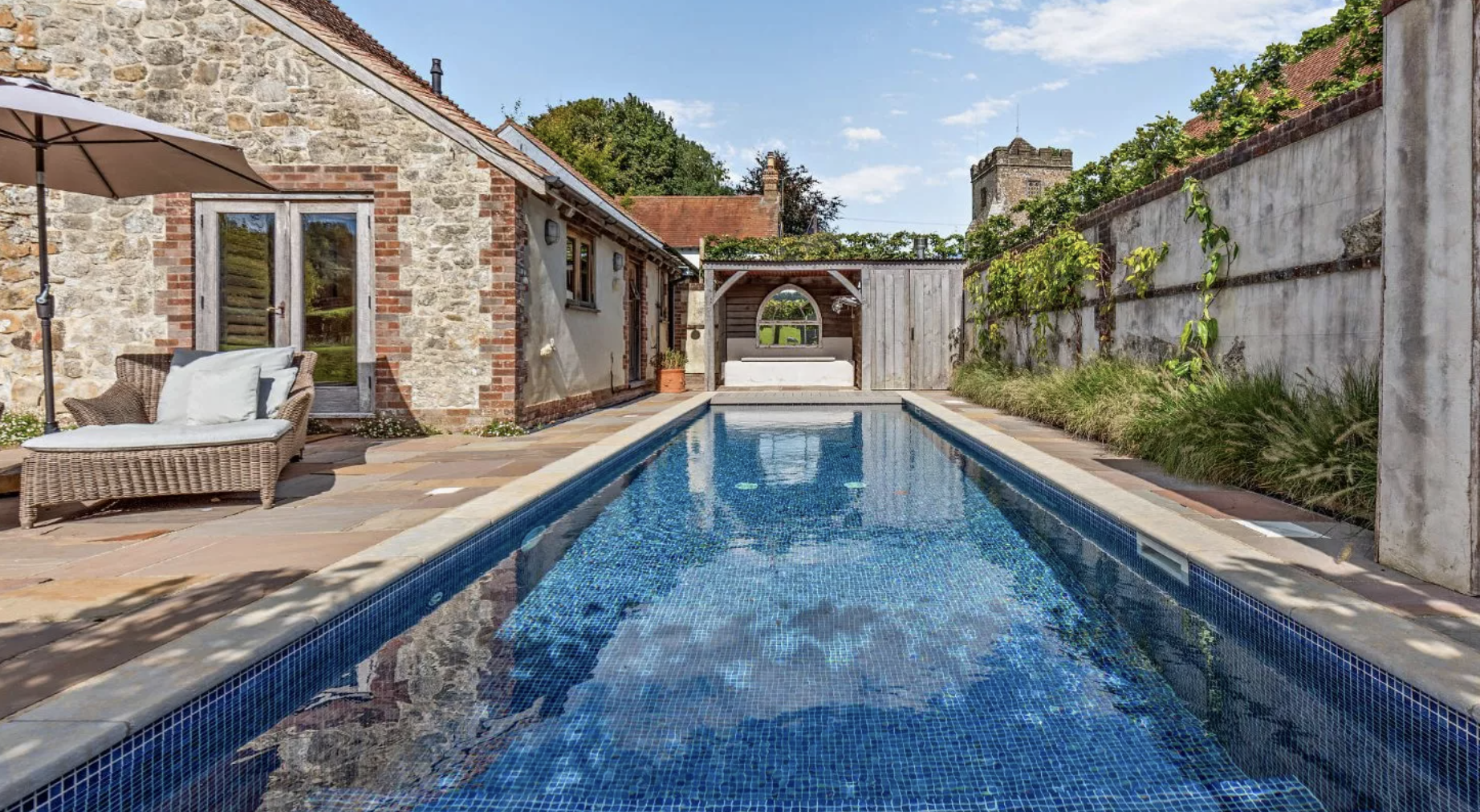 The mainly lawned landscaped garden has a paved central courtyard with covered seating and dining areas, a part-walled swimming pool complex with open-sided seating area and bar with fireplace and a large paved terrace, together with a shepherd’s hut, outbuilding with gym with first floor over, store, cloakroom and part-covered deck.