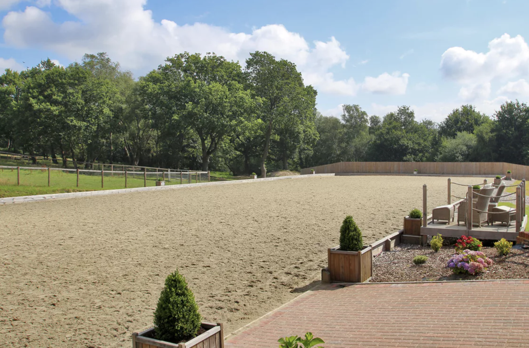 The level fields are fenced and divided into several smaller connecting turnout paddocks. The surrounding outbuildings include a workshop (which was previously a squash court), a hay store, a triple stable block and further garaging and stores. There is also a horse walker.