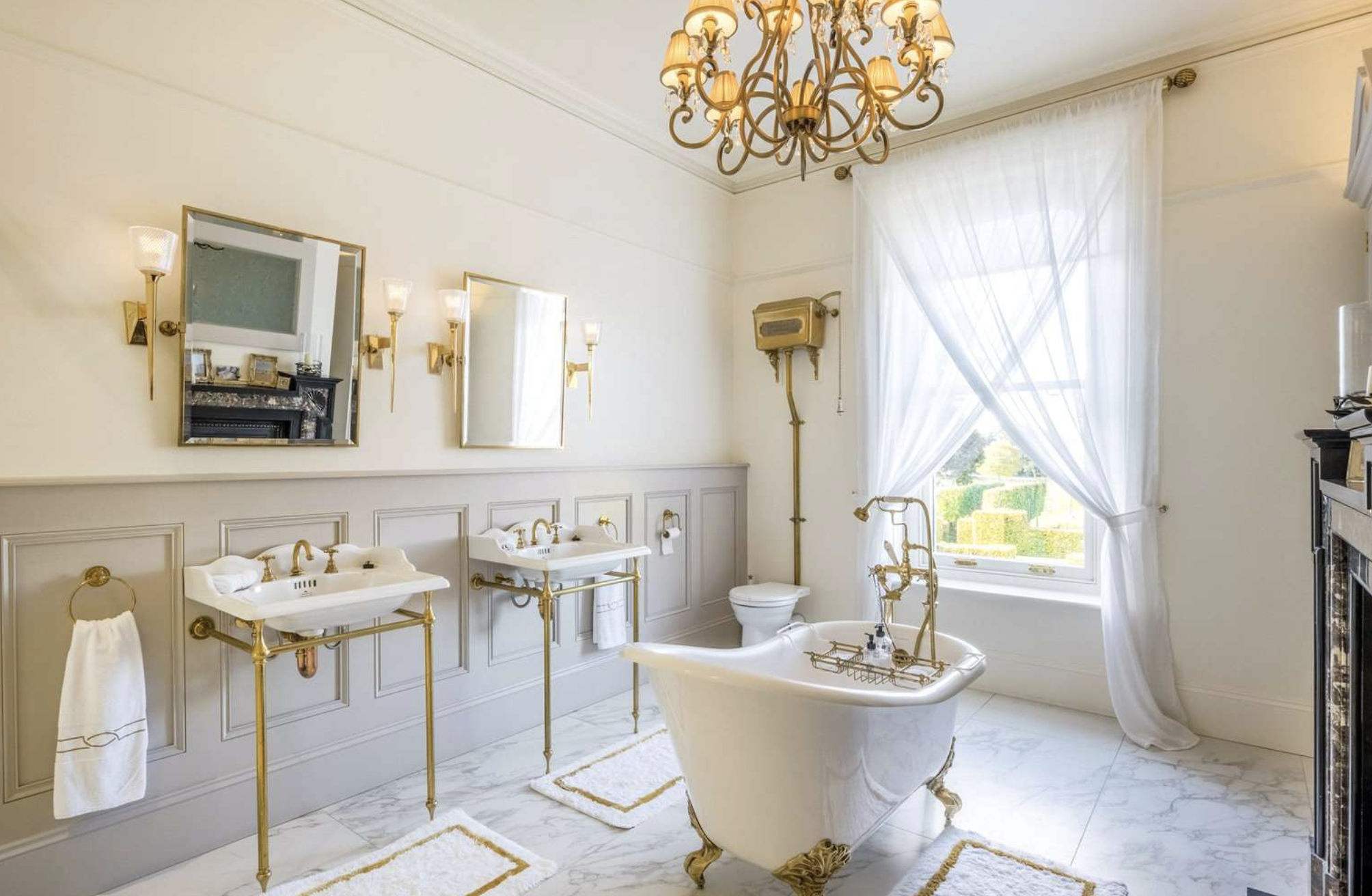 On the first floor there is a principal bedroom suite, with an open fireplace, a dressing room with a wash basin and fitted wardrobes and an en-suite bathroom with twin basins, standalone bath and separate shower.