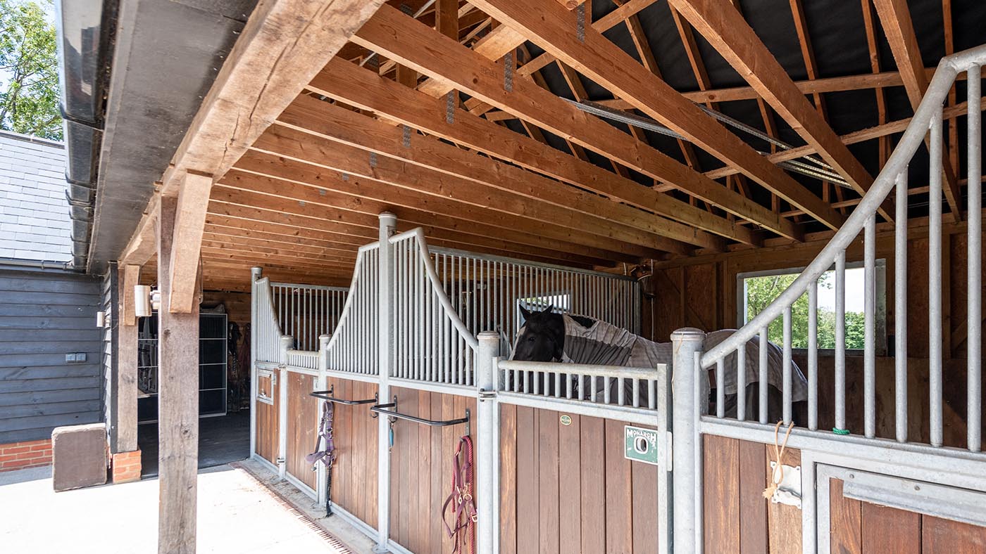 The compact equestrian facilities include five stables, a sand school, an indoor preparation area, a groom’s room and storage space, with the grounds and post-and-rail paddocks set within two acres.