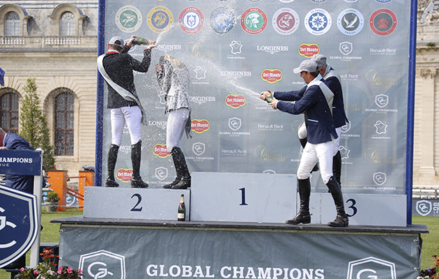 USA rider Paris Sellon (yes she’s in there somewhere) gets a champagne soaking on the Global Champions League podium having helped Miami Glory to second place in the team competition. Anyone know any good dry cleaners?