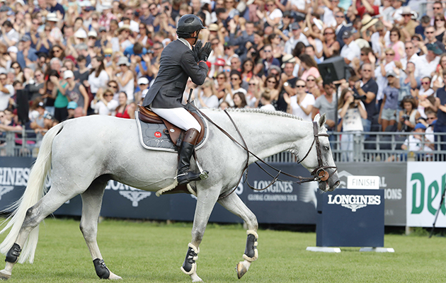 Leading French rider Philippe Rozier receives a standing ovation — and in turn thanks the crowd — for his jump-off round with Rahotep De Toscane which earned them third spot on the grand prix podium