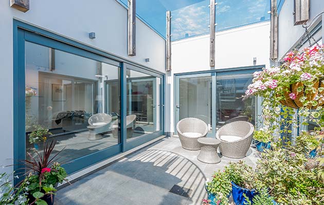 Submerged lower ground floor is designed around a sunken courtyard area and includes three more bedrooms with en-suites.