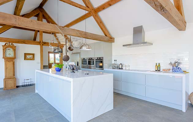 Boasting oak trusses and sections of exposed stone, the ground floor hall leads into an open-plan, fitted kitchen, which has space for a dining area.