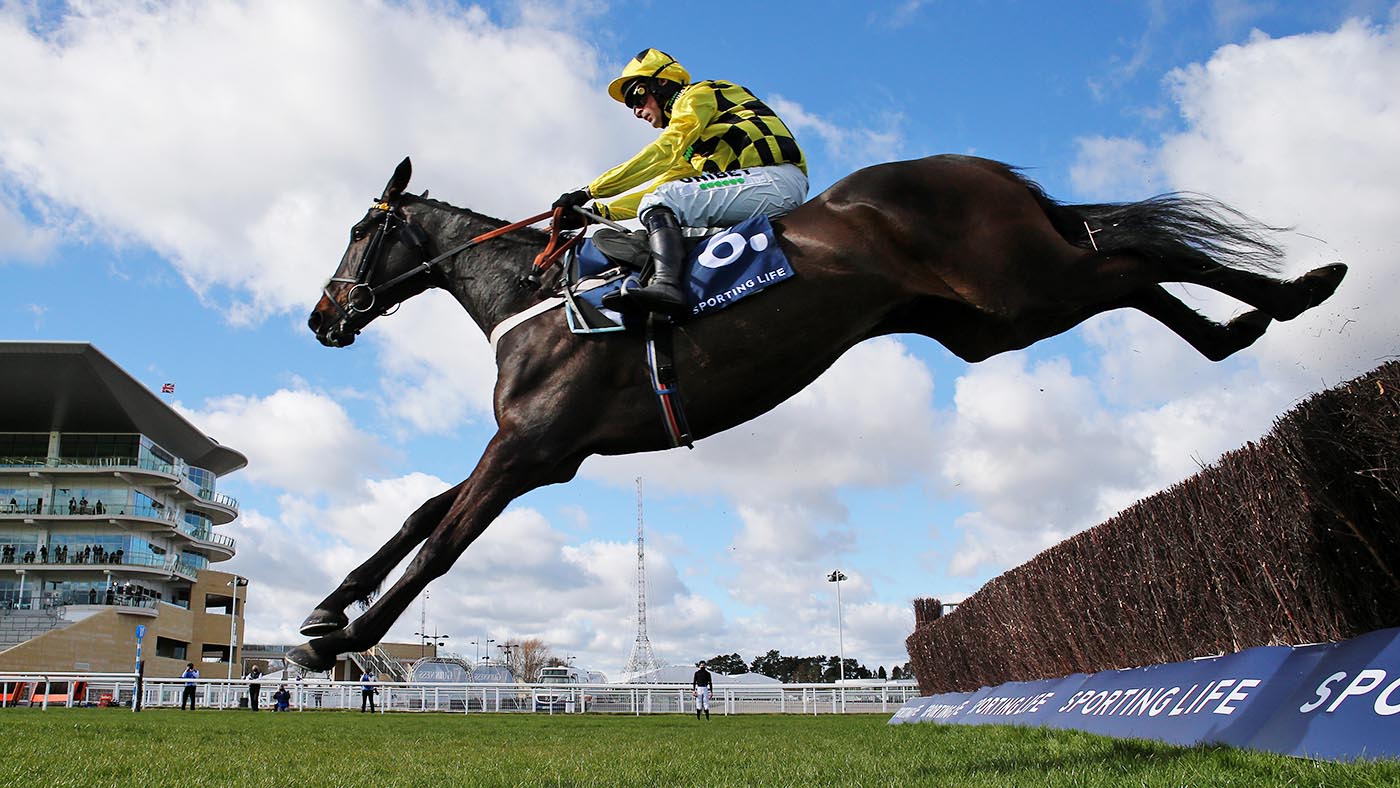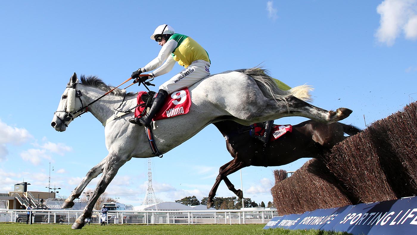 Eleven-year-old Vintage Clouds ridden by Ryan Mania jumps the last to win the Ultima Handicap Chase for owner Trevor Hemmings and trainer Sue Smith.