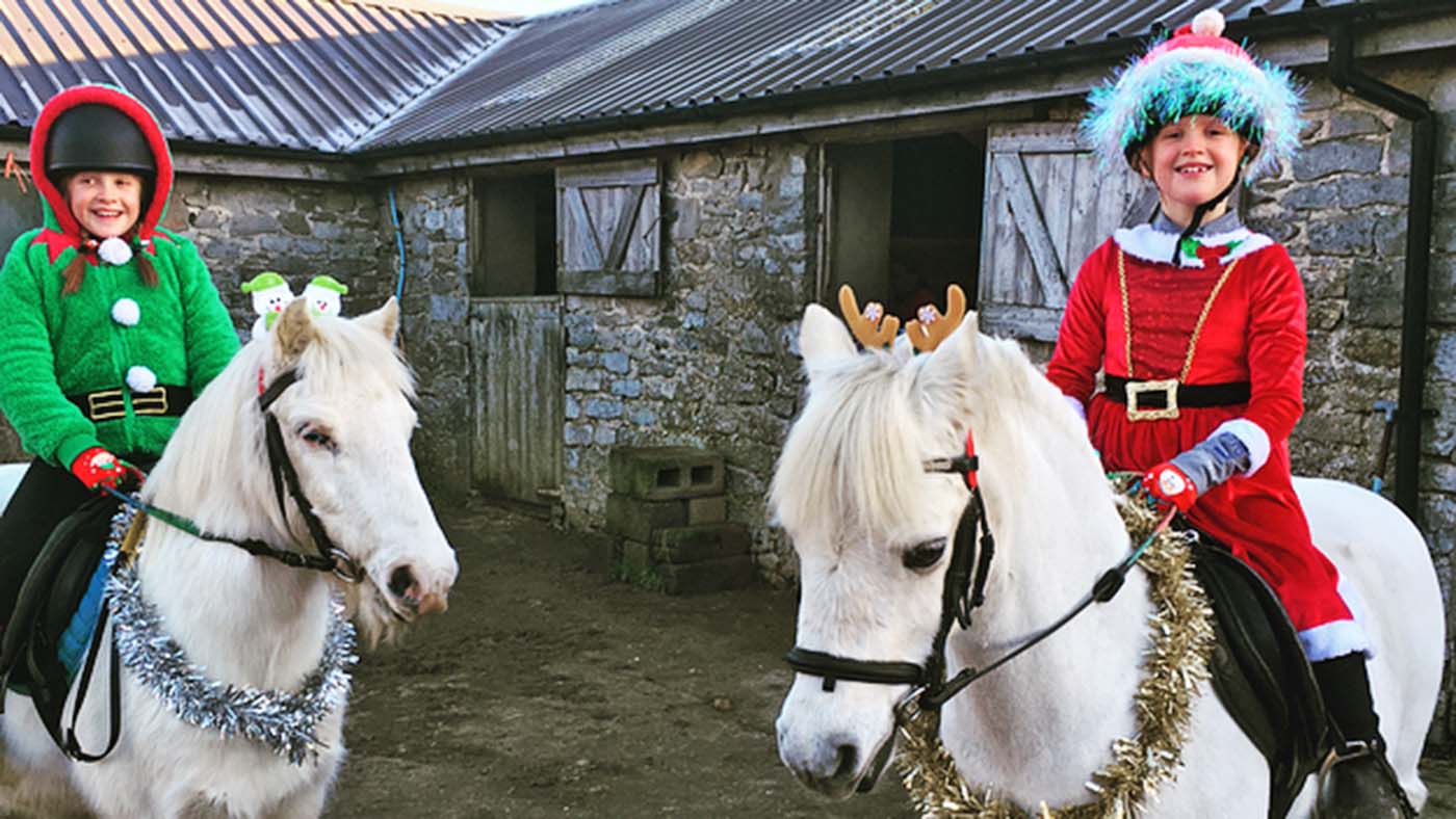“Here are my seven-year-old twin daughters, Jess and Emma, on their ponies Crumpet and Bluey undertaking a virtual Christmas fun ride to raise money for Mount Pleasant RDA group” — Sarah Harris