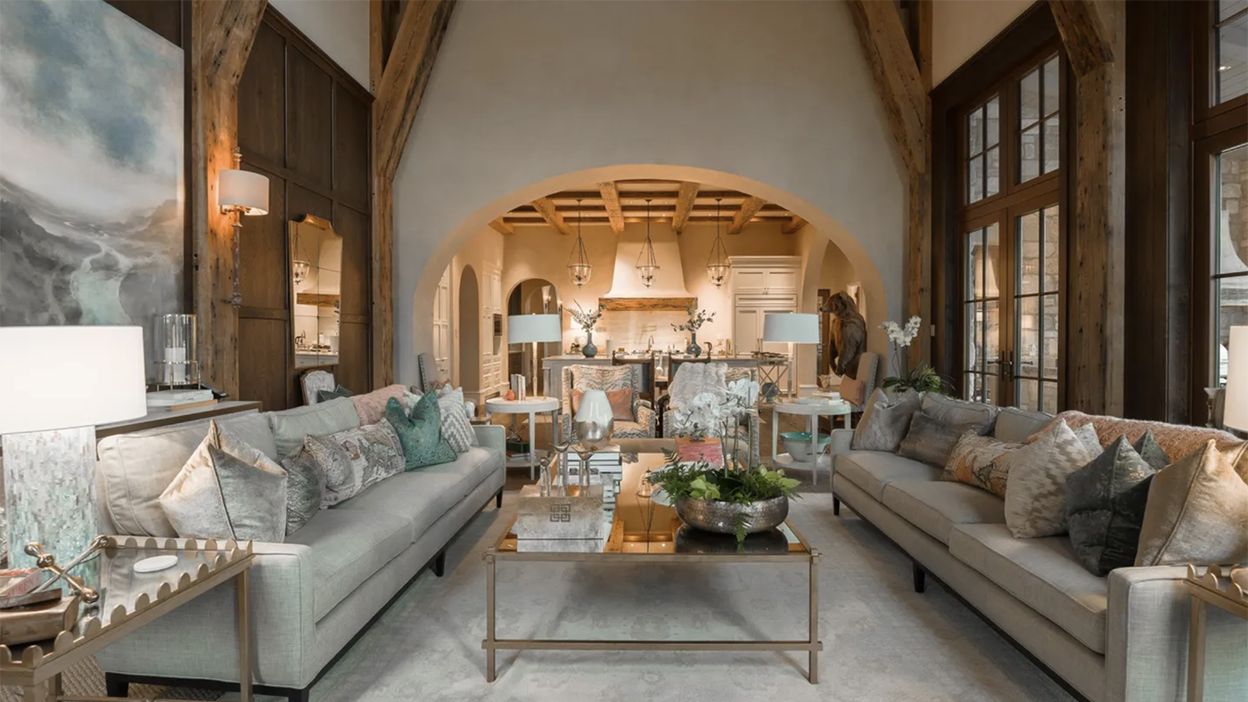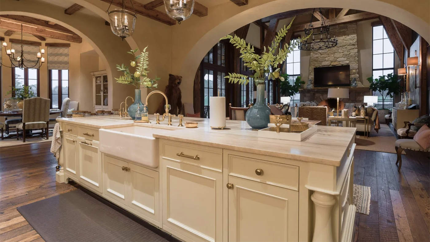 The home’s interior is inspired by the English manors of the Cotswolds. The kitchen boasts a coffered ceiling and vent hood made from Longleaf pine beams, stone countertops, along with a custom Lacanche range and a Sub-Zero refrigerator.