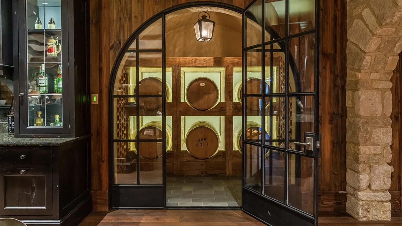 The home’s lower level evokes the feeling of an old world European pub, featuring reclaimed wooden beams from barns across Kentucky, leather furniture and a temperature-controlled wine cellar.