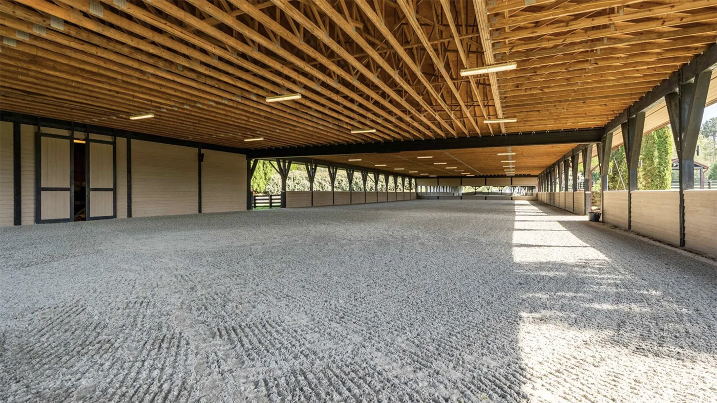 There are three arenas in total, one for warming up, one for dressage and another for jumping. The covered arena is irrigated and features a mirrored wall and an adjacent storage area.