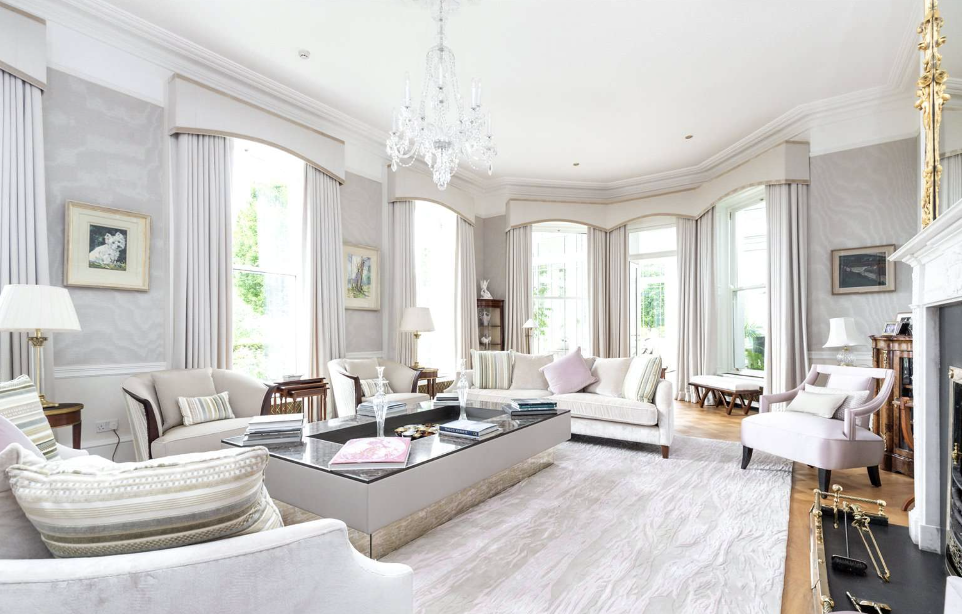 The front reception hall features a fireplace and gallery landing. This area leads into the three primary reception rooms, each with high ceilings and views of the gardens and lake.