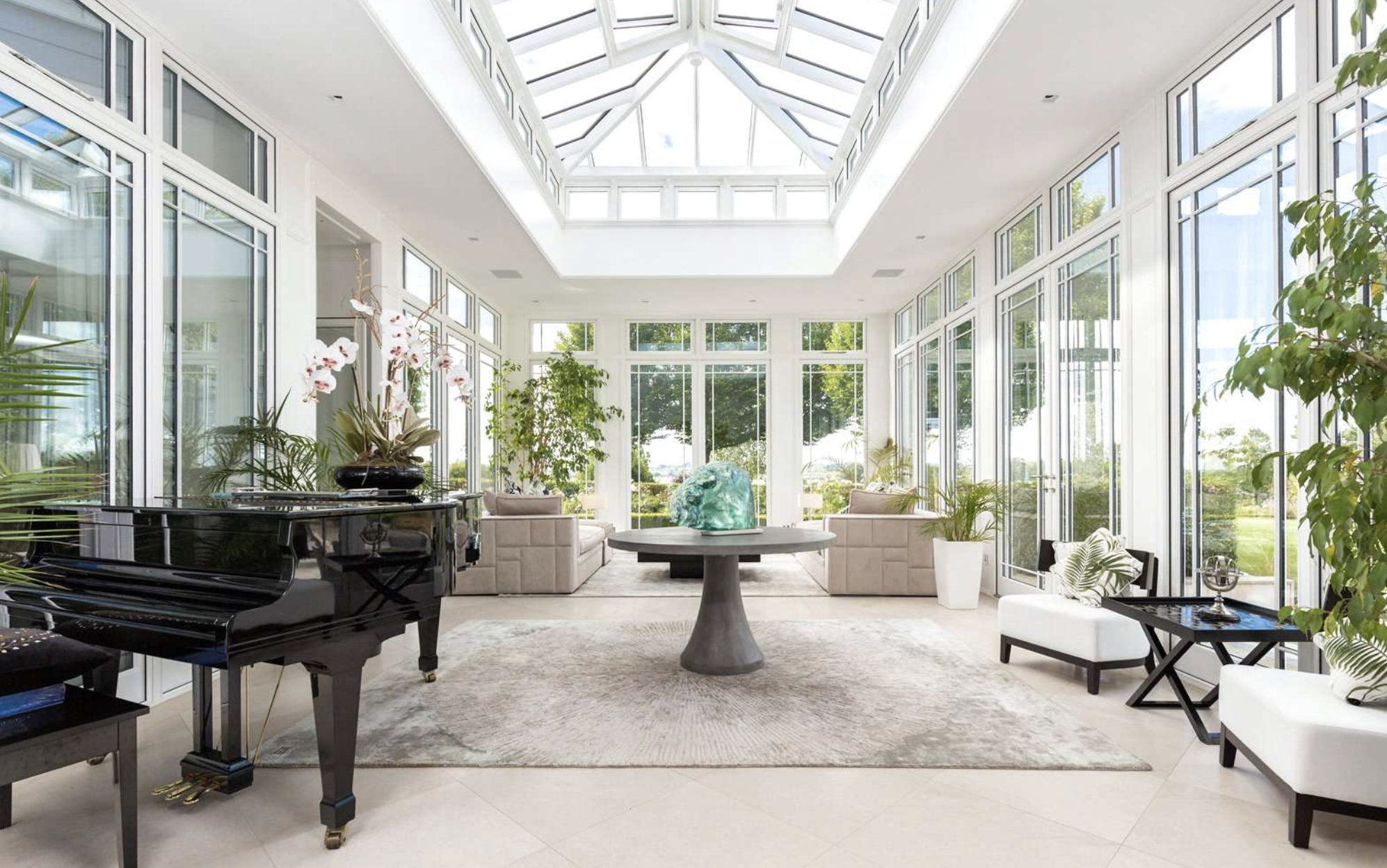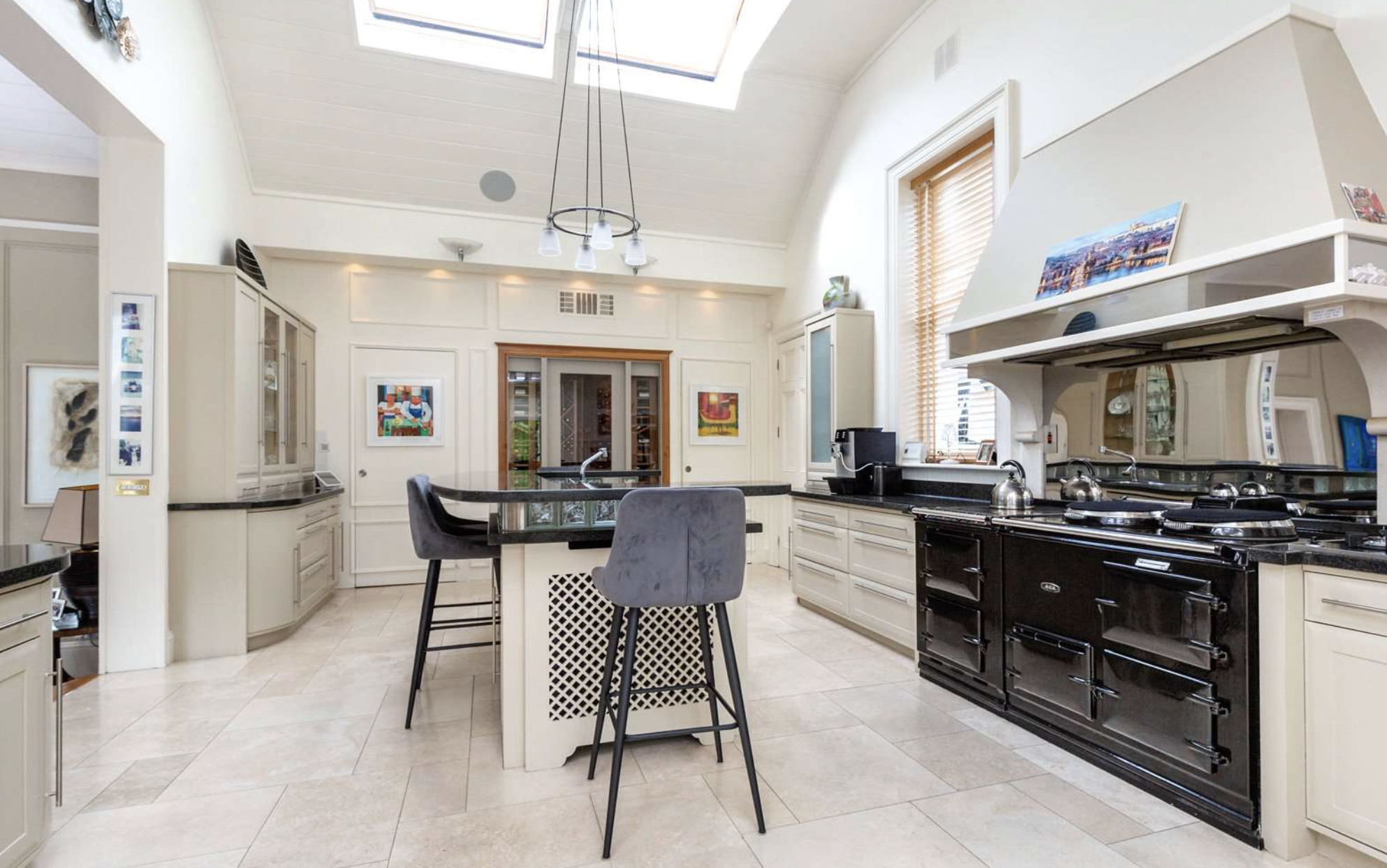 The kitchen has a vaulted ceiling, an array of finely crafted floor and wall-mounted units with granite-topped surfaces, an Aga and a floor-to-ceiling walk-in wine cellar. It also includes a small hidden kitchen. The kitchen opens to a breakfast room, as well as a sunroom with dining area and family room.