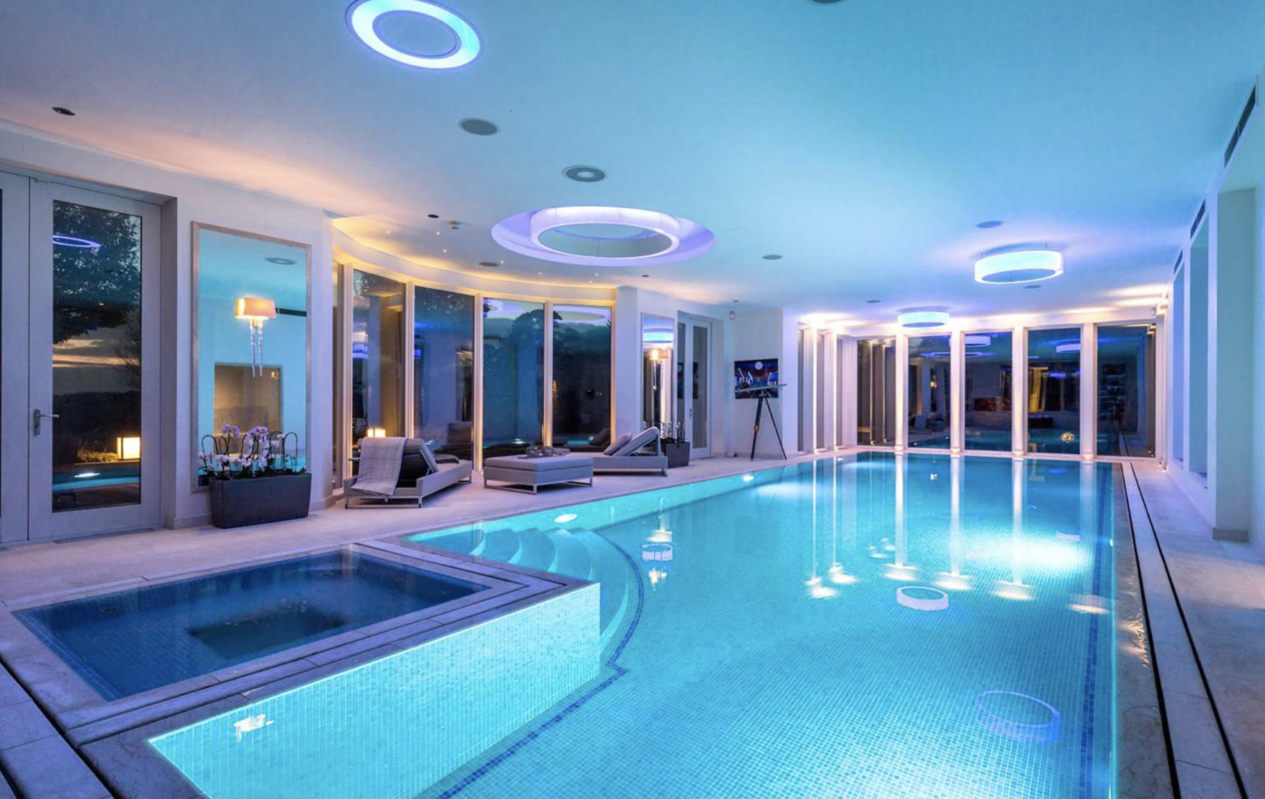 The house is furnished with contemporary features, including an integrated Crestron lighting and sound system throughout the entire property, both internally and externally. It also includes gas fires, double glazing, air conditioning in the gym and master suite, as well as underfloor heating in the west wing of the house.