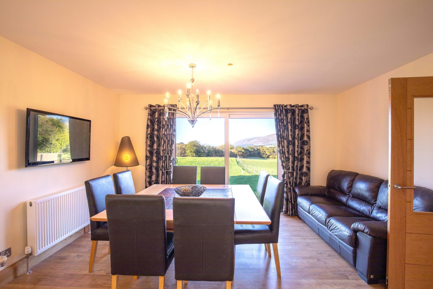 The sitting room has a vaulted ceiling, an oak floor and a multi fuel stove and patio doors open to the timber decking with views over the hills.