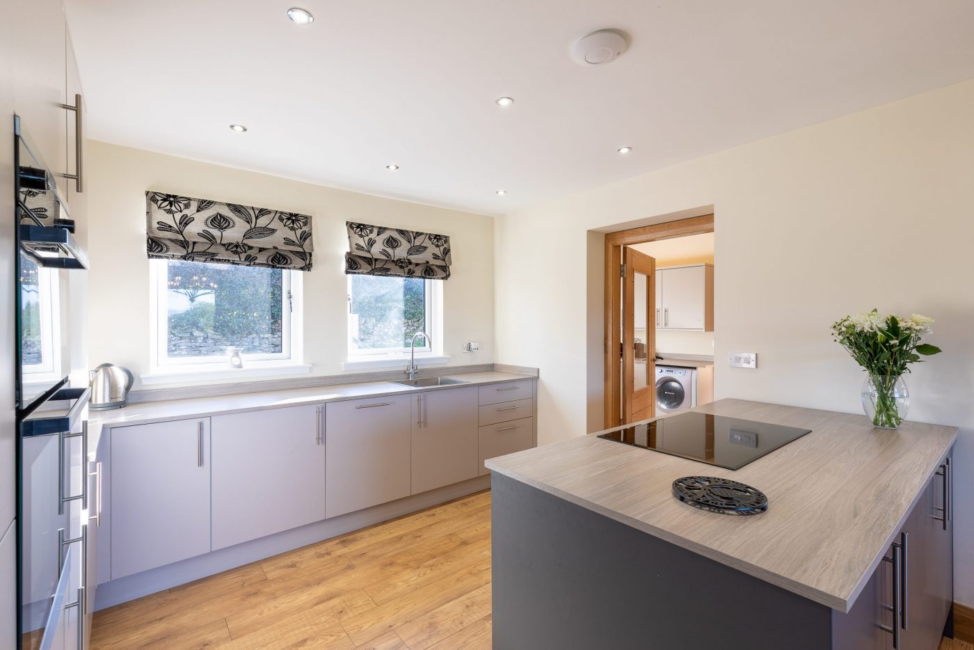 The dining area is open plan with the kitchen, which has base and wall units including pan drawers, contrasting work surfaces and an inset sink and mixer tap. The integrated appliances include a double oven, fridge/freezer and an induction hob. There is also a utility room, which the current owners have used as a home office.