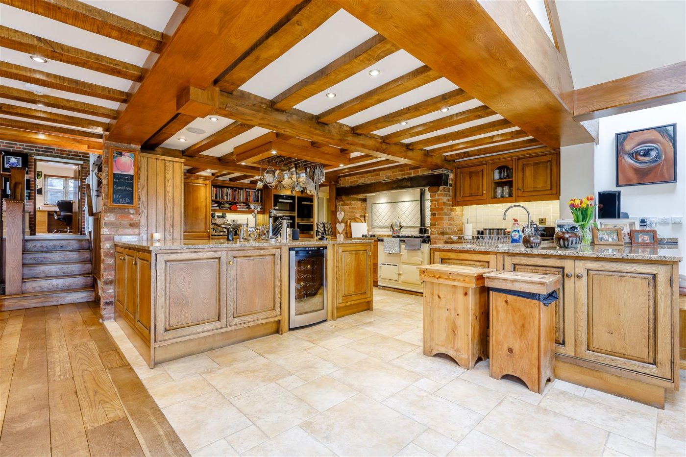 At the heart of the home is the open-plan kitchen and dining space with underfloor heating complete with Aga and walk-in pantry, that extends to the garden room. From the boot room there is direct access to the stables and equestrian facilities.
