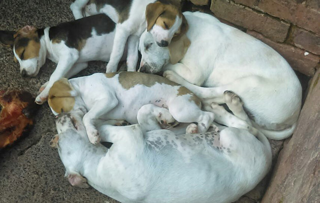 6. Three beagle puppies from the Dummer and two Ludlow foxhound puppies curl up for a snooze