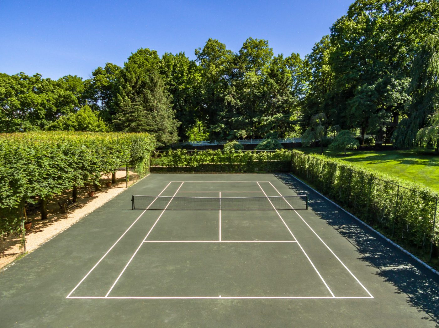 Other features include English sculptured sunken gardens, sprawling verdant lawns, old stone walls, an outdoor pool and a tennis court.
