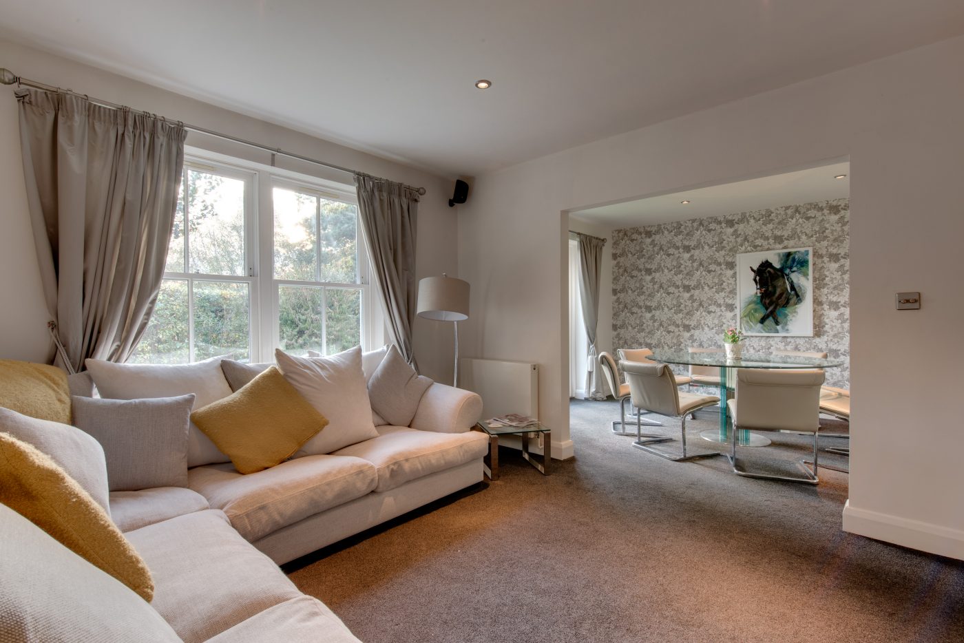The main sitting room has a dining room area with double doors leading out onto the garden terraces.