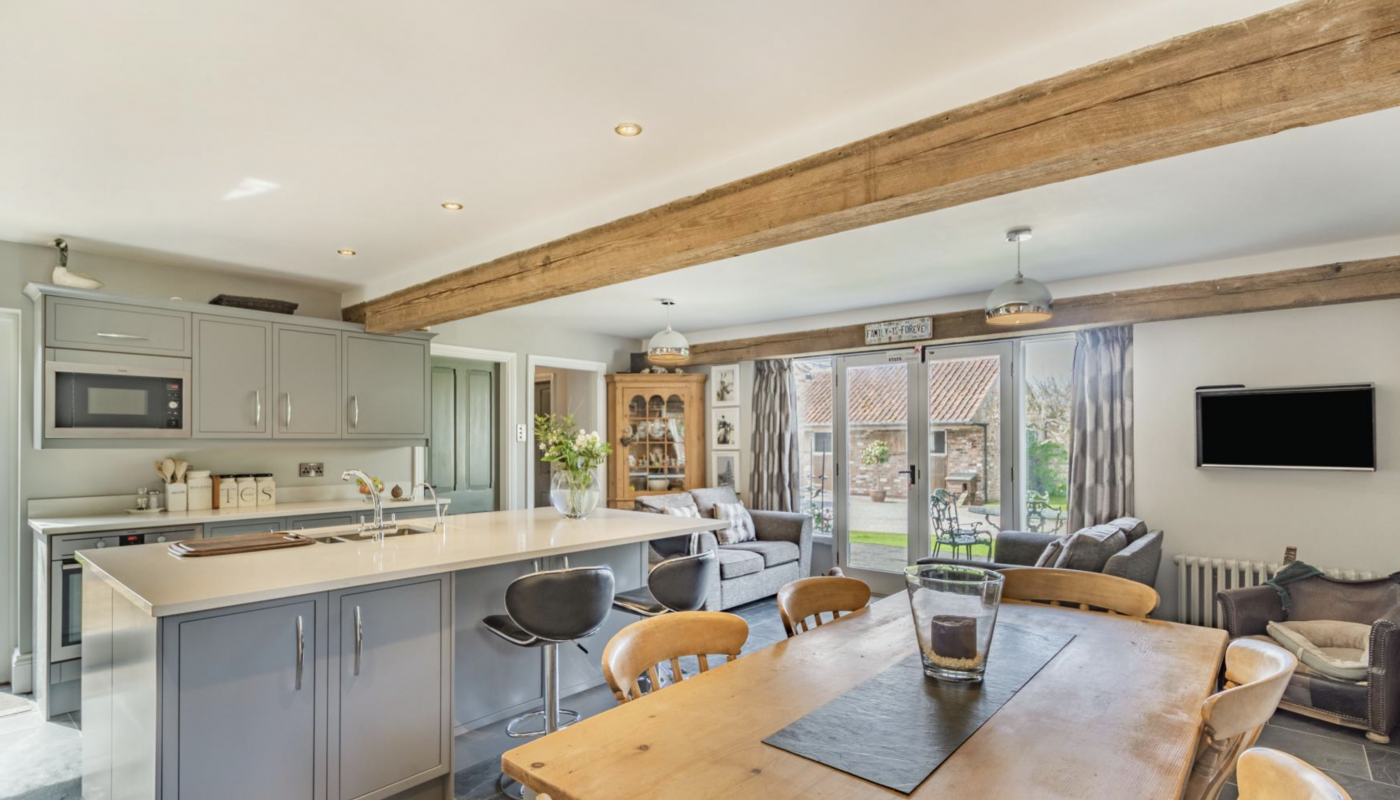 Inside the house is a large open plan kitchen/dining room that can seat at least 12 people, plus a living room.