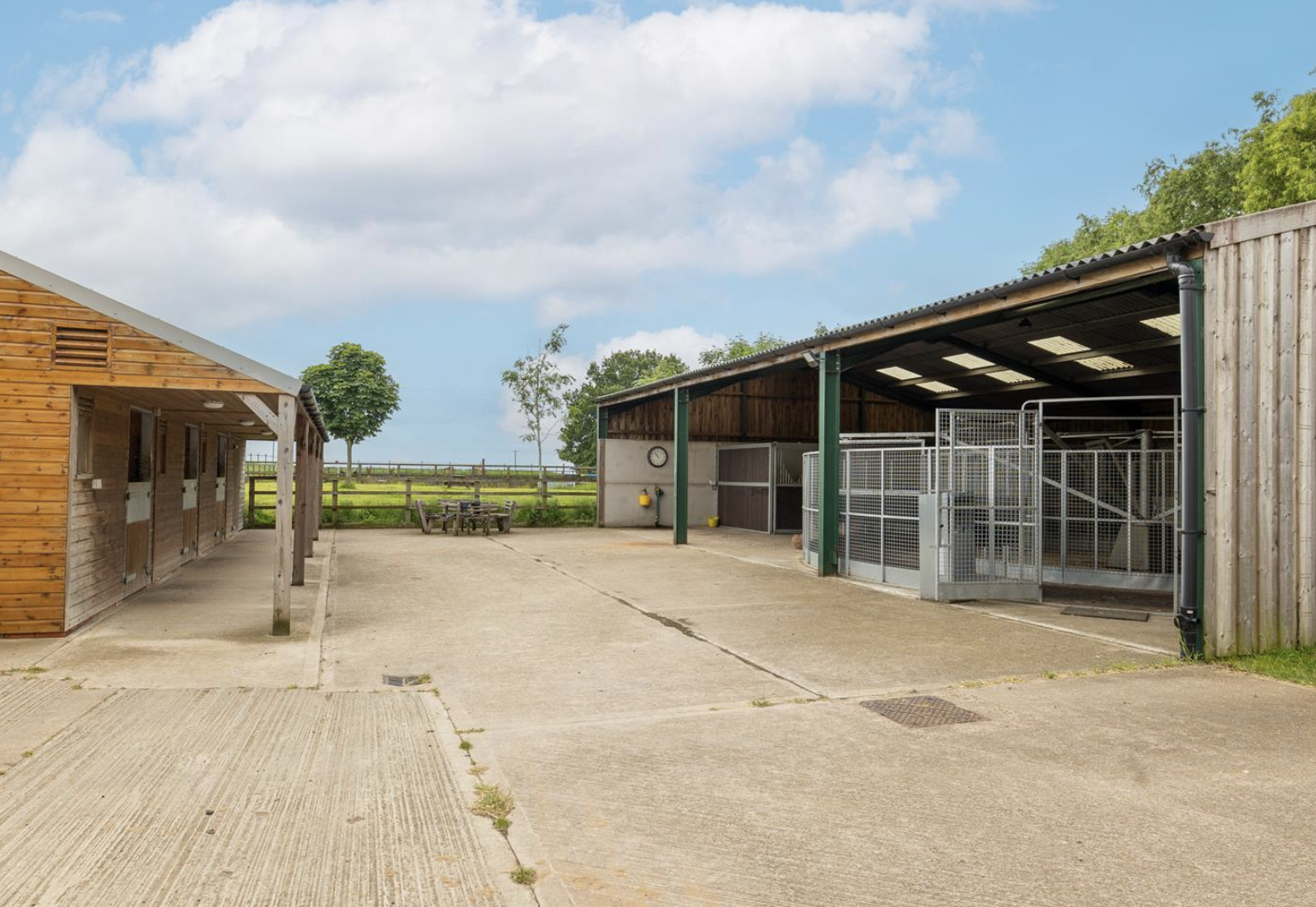The equestrian facilities include brick stables, timber stables, a barn with covered horse walker and further stabling, a Dutch barn with stables below, 30x60m floodlit manége with sand and rubber surface, plus a lunge pen and pasture land.