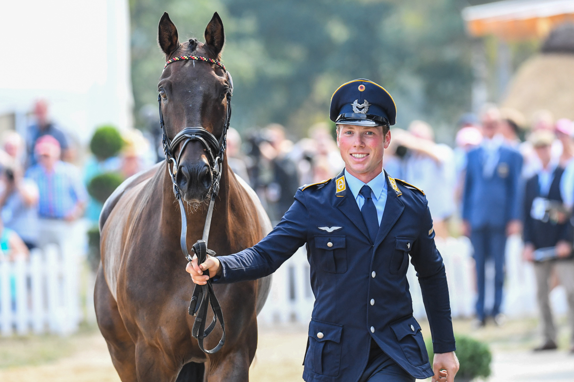2. Individual rider for Germany, 26-year-old Felix Etzel, looks cheerful in his uniform while trotting up Bandit 436