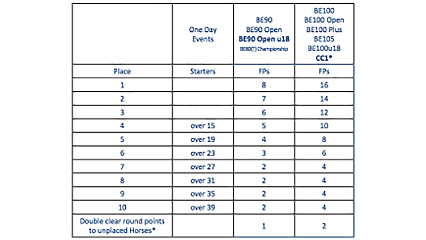 Horses that have one point or more must compete in open classes at BE100 level and below and horses with 21 or more points must compete in open classes at novice level.