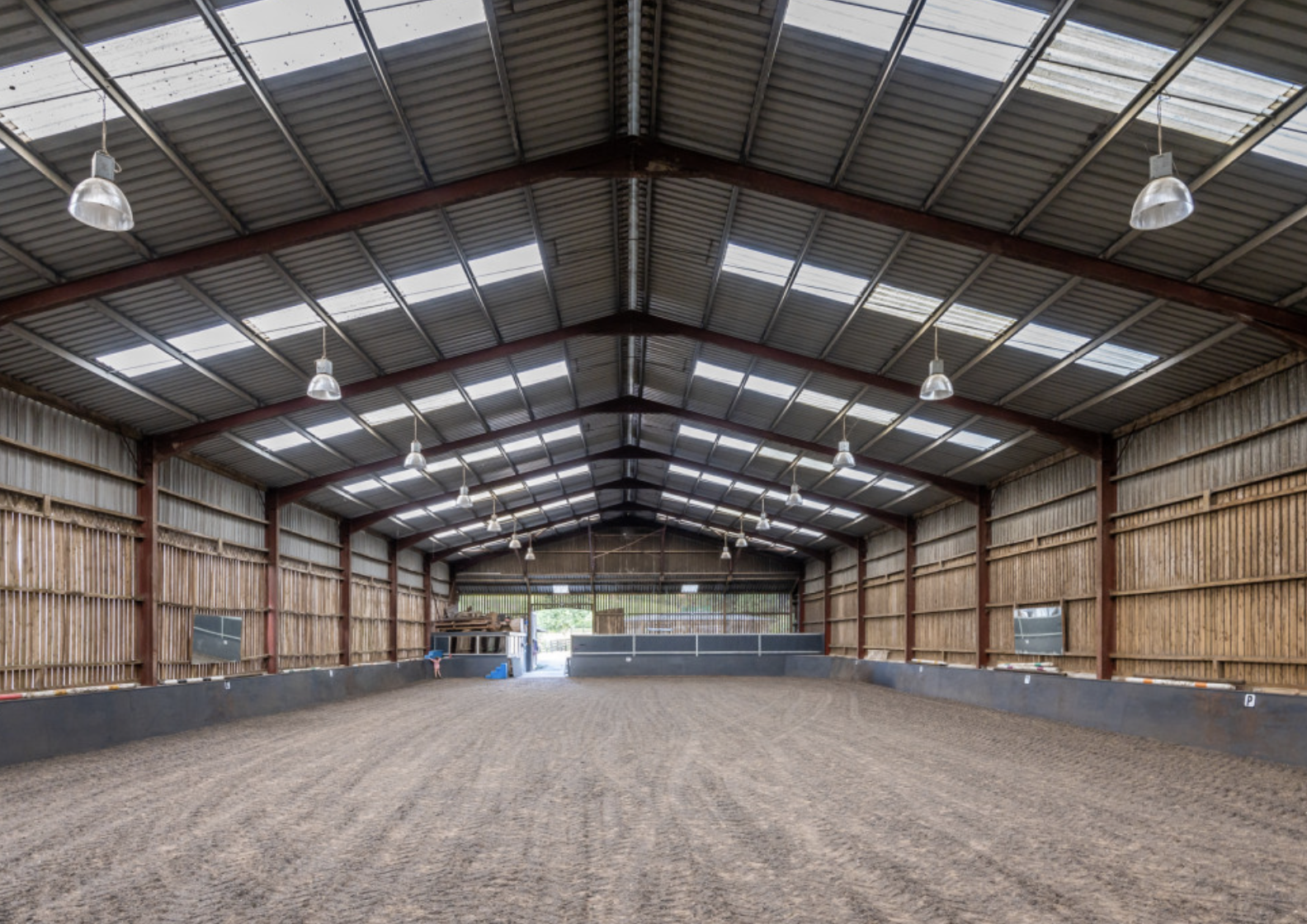 There is an indoor arena with a rubber and waxed sand surface, heated viewing area and extensive lighting with training mirrors.