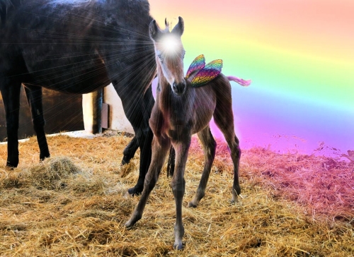 “One of the mares, I won’t give her name as I haven’t even told the owner yet but she only retired from racing last September, has given birth to an unusual foal,” said Mick. “The foal appears to have a small horn in the middle of her forehead. If all is to be believed, she may also have wings. I’d never heard of anything quite like it. So I asked Richard Lingwood, the Stud manager, to send me a picture straight away I could not believe what I saw.”