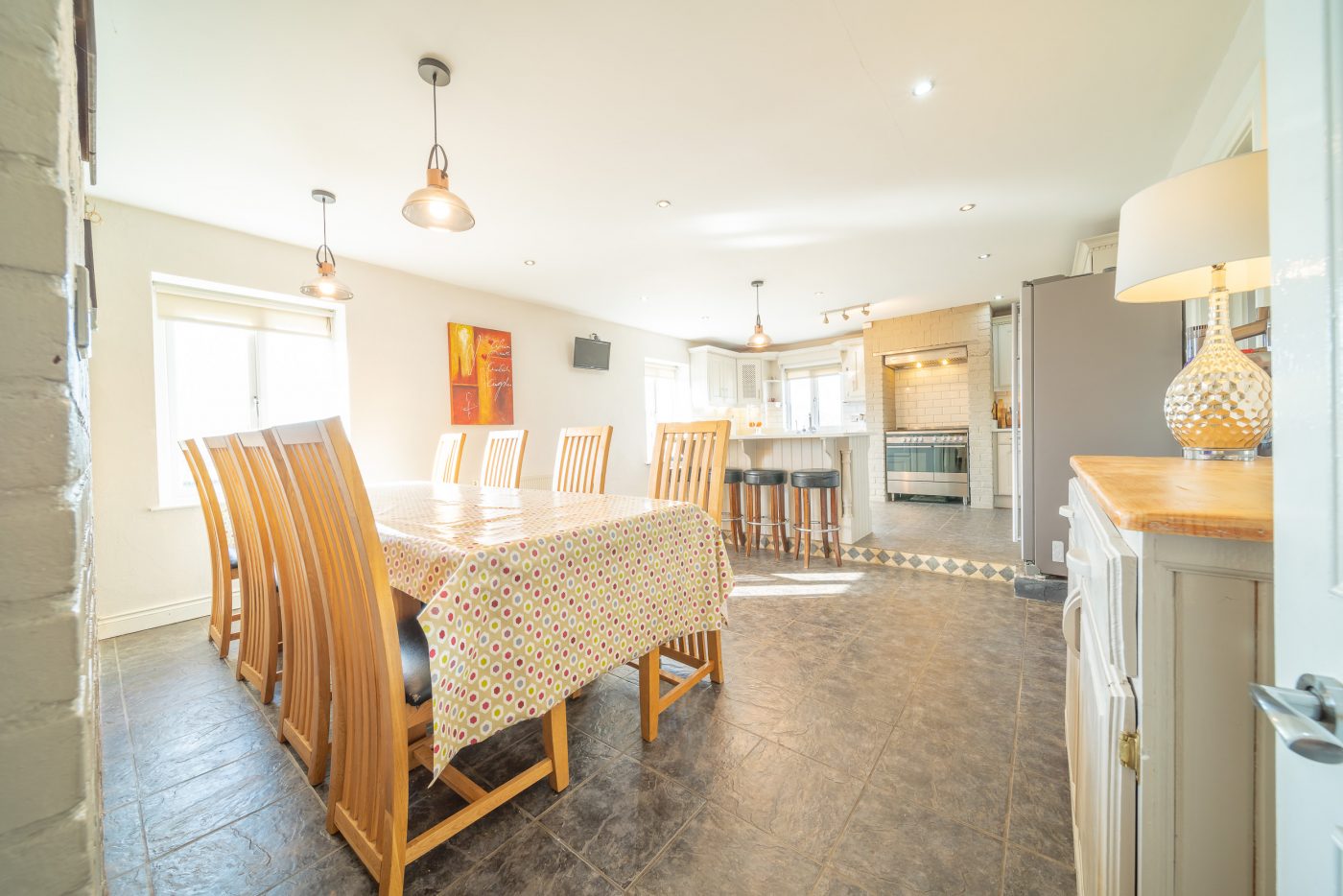 The four-bedroom house has accommodation set over two floors. The spacious kitchen boasts a tiled split-level floor, central island and quartz work surfaces.