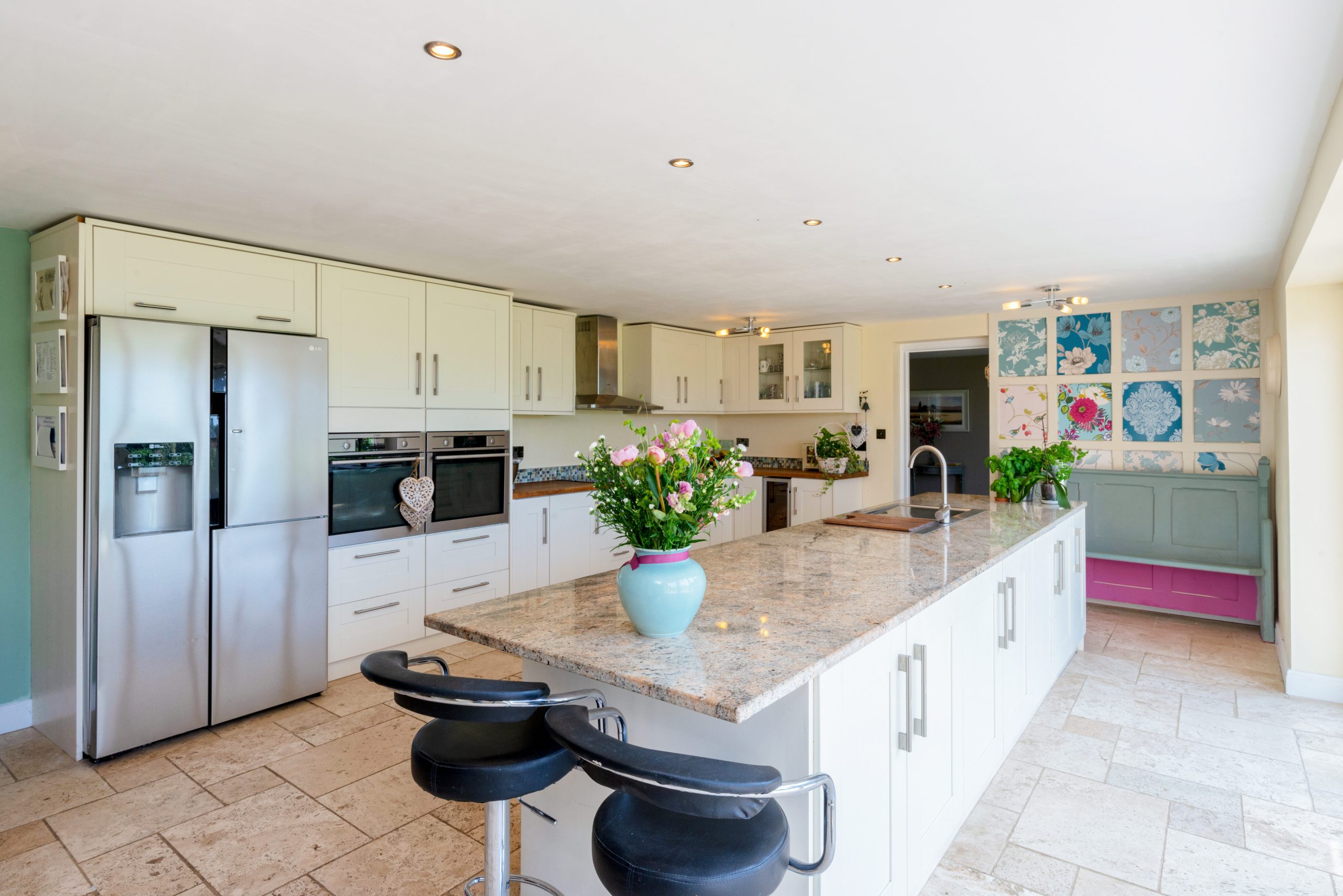 The family kitchen is a particular highlight of the home with its built-in fridge and central island with marble worktops.