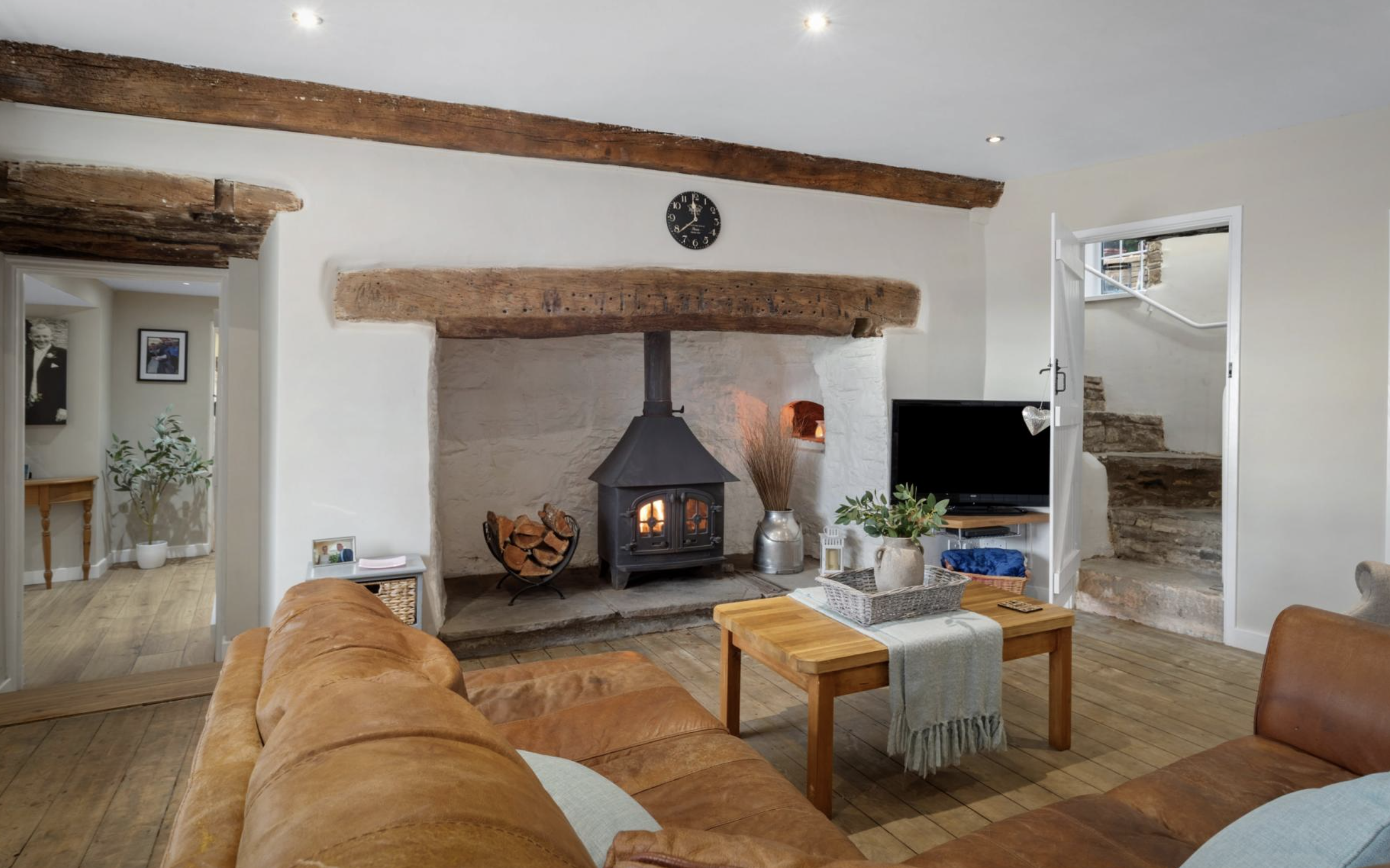 The current living room is the core of the former farmhouse, with an original floor, inglenook fireplace with bread oven, exposed beams, wood floor, and original stone staircase.