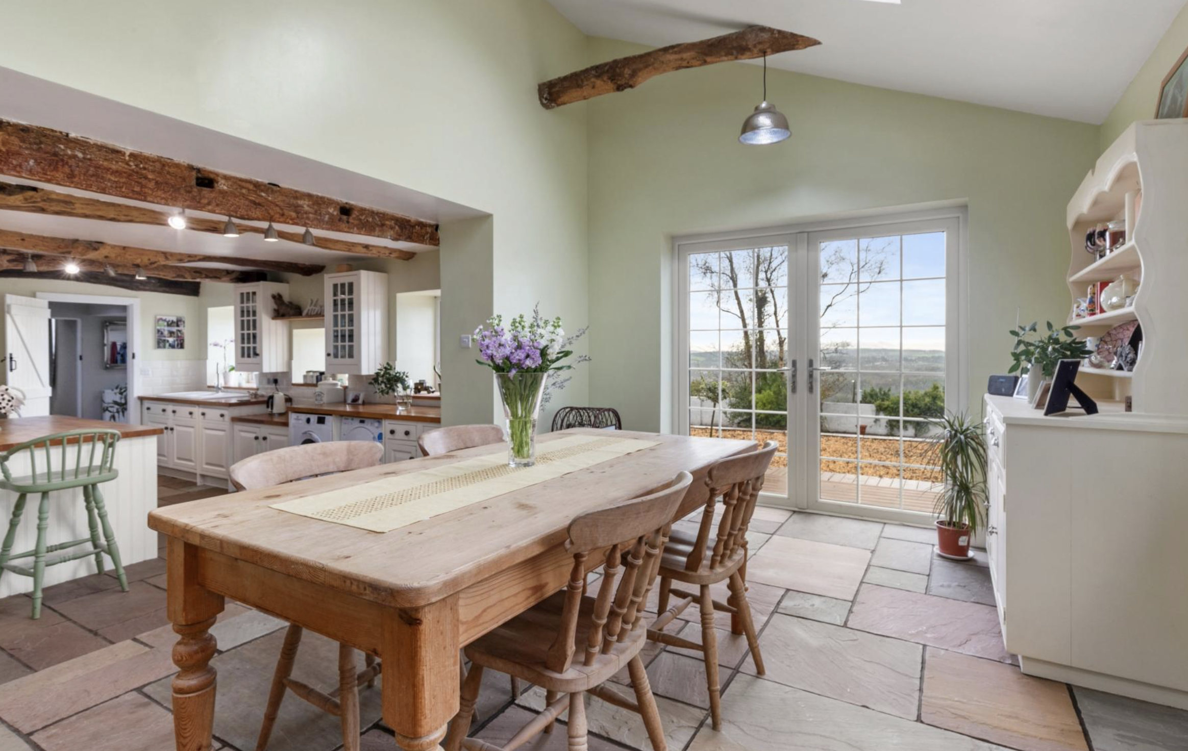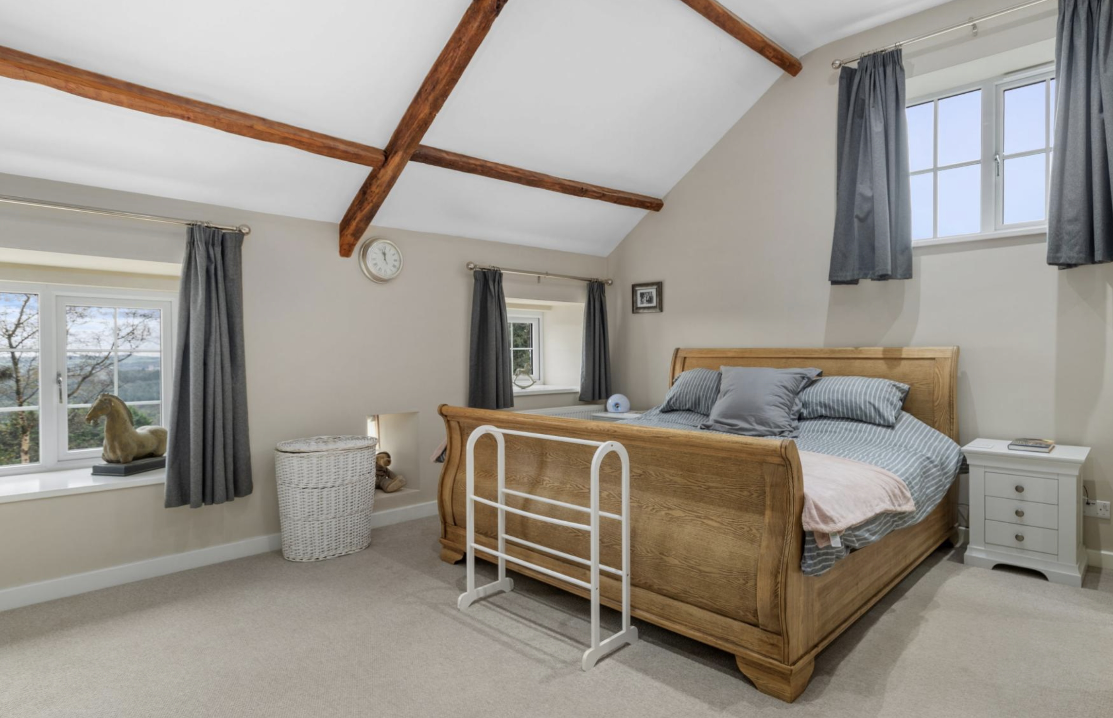Upstairs there are four bedrooms and three bathrooms. The principal bedroom is a double-height space with exposed beams and three windows, plus it has an en-suite.