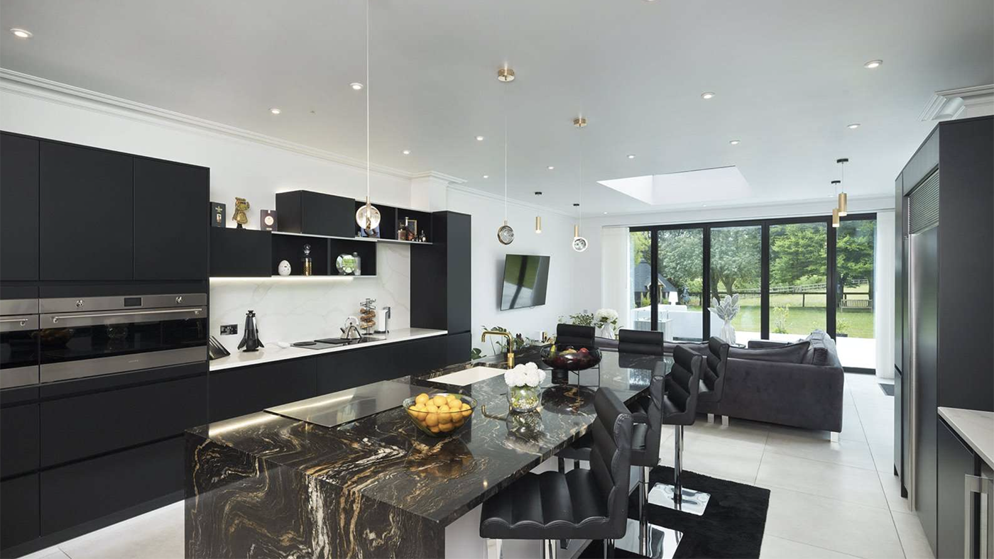 The south-facing kitchen has quartz counter tops and a granite island with an instant hot water tap and double sink as well as a wine fridge. The walk-in pantry is with fitted storage and integrated coffee machine and microwave. A recent addition to the kitchen is the sitting area at one end, with a glass roof lantern and bi-fold doors leading out to the terrace and garden.