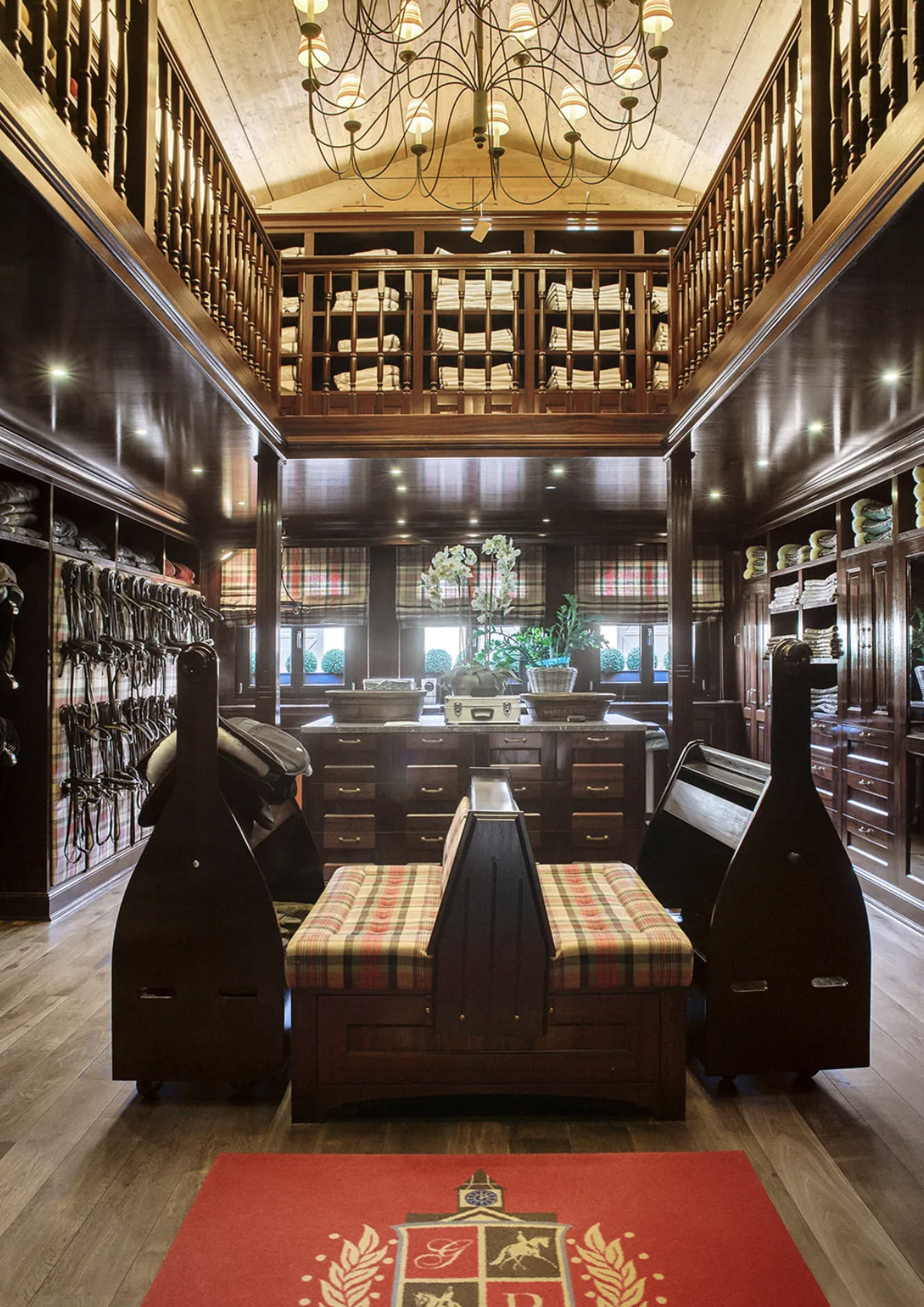 There is a two-storey tack room furnished by Ralph Lauren Home.