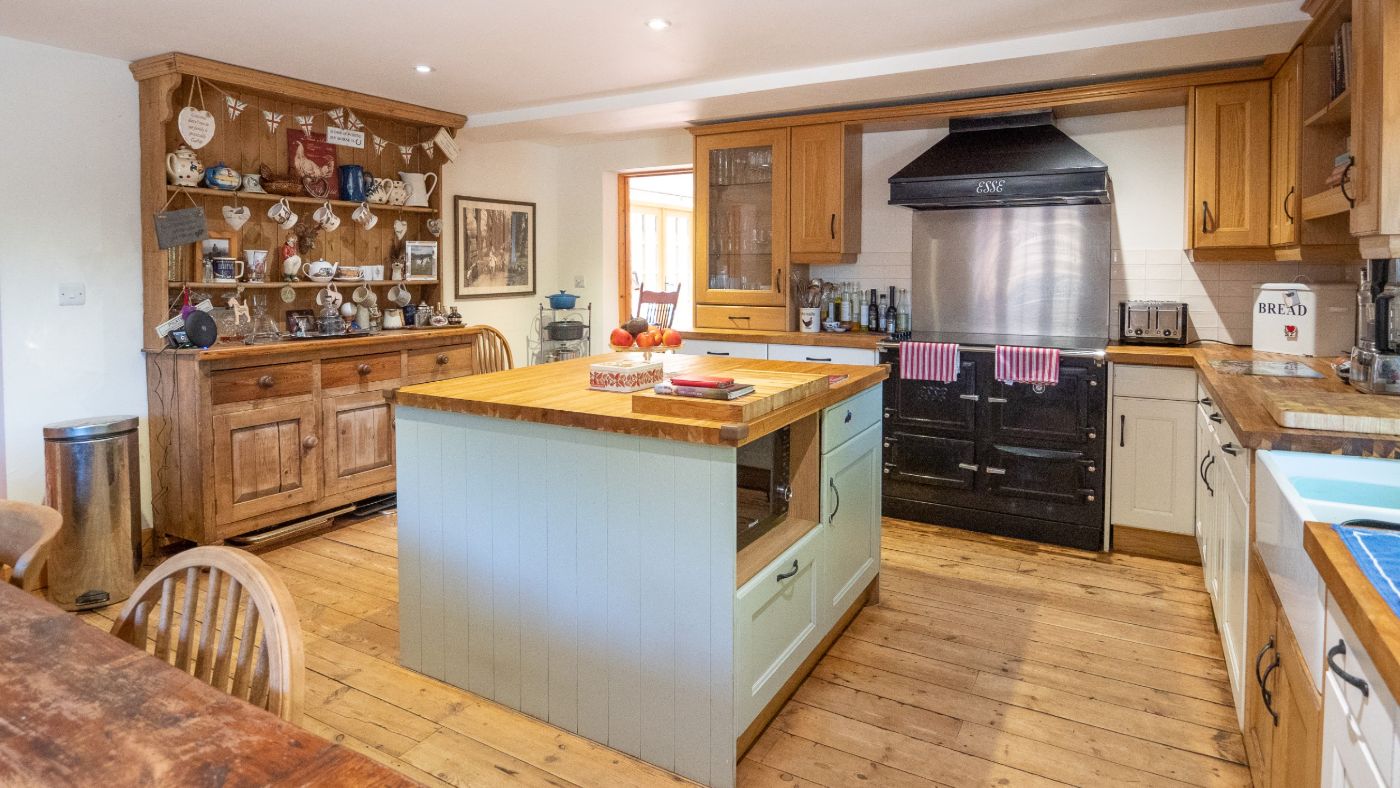 A covered porch leads to a reception hall with a door, which leads through to a south-facing sheltered terrace. Off the hall, you’ll find the kitchen/breakfast room with twin glazed sinks, a range cooker and a central island. This room leads to the triple-aspect living room, which has a brick fireplace with a wood burner.