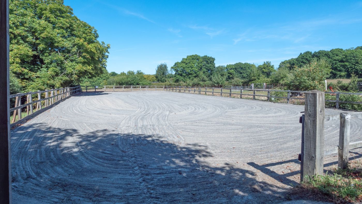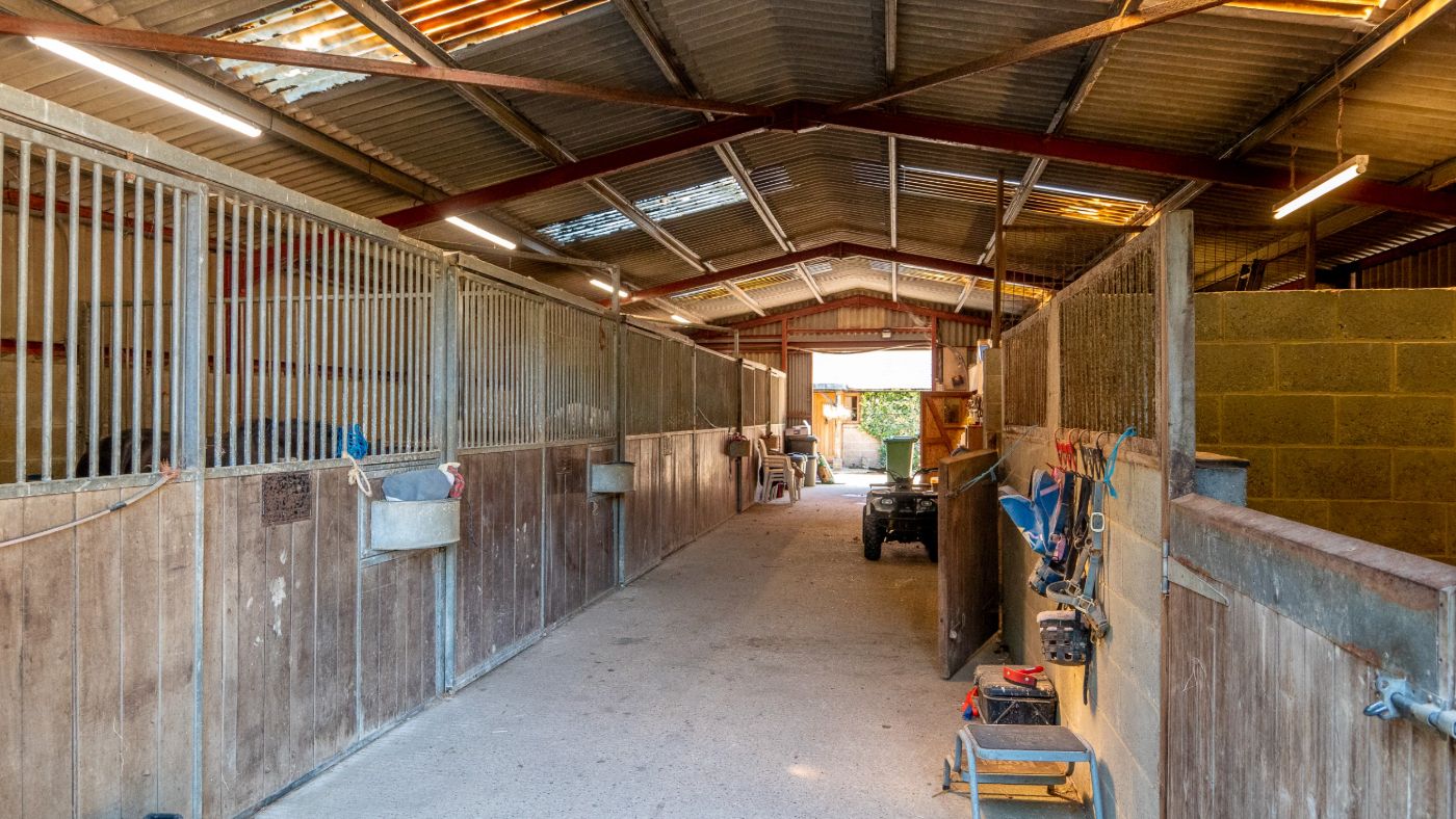 An enclosed barn houses four loose boxes, two pony boxes, feed and tack rooms. There’s also a hay storage area and a workshop. Other outbuildings include a tractor shed, an open-fronted garage and three field shelters in the paddocks. Close to the barn is a post-and-rail sand school.
