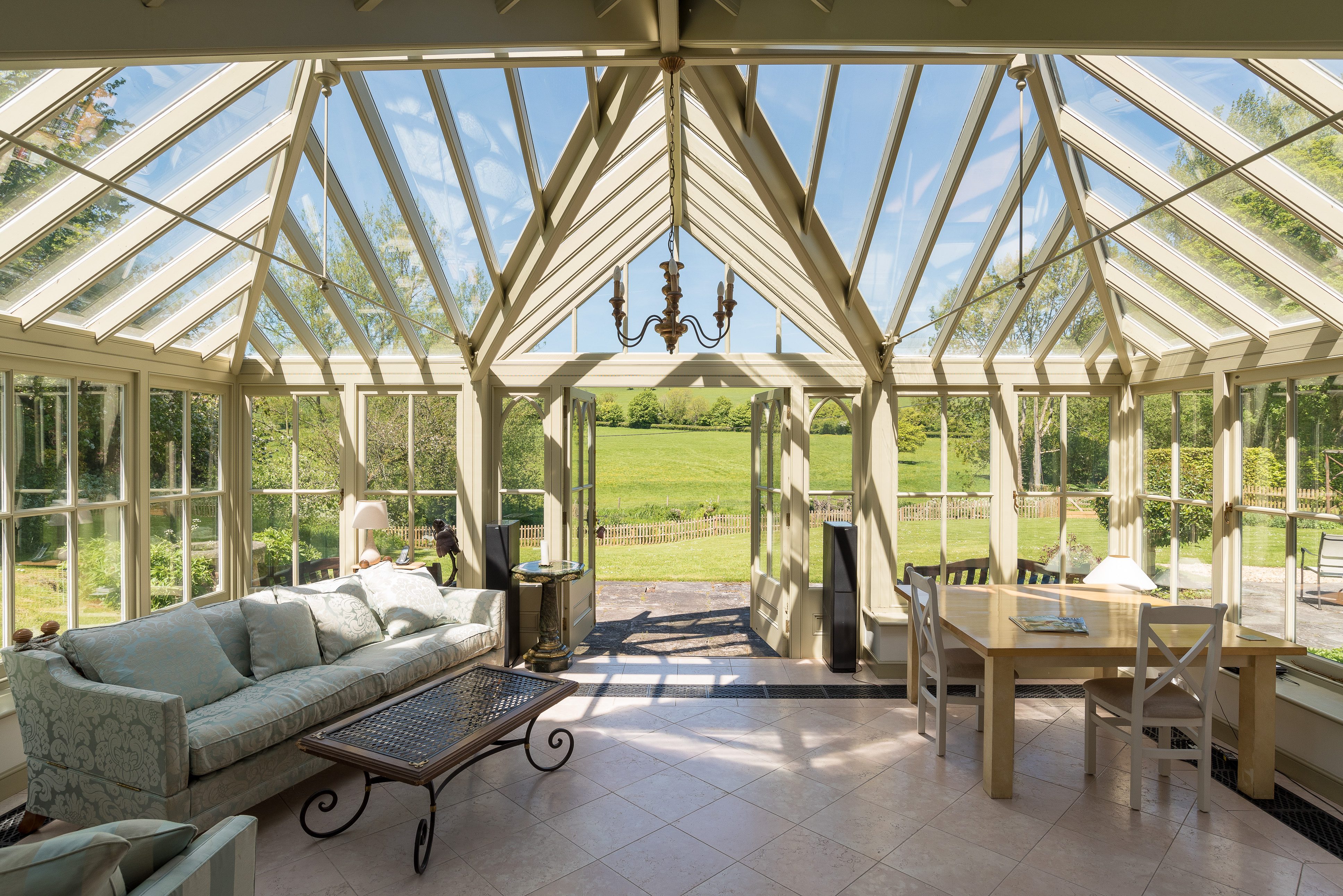 The drawing room connects via double doors to the impressive conservatory, which makes the most of the stunning views across the valley and over the river.