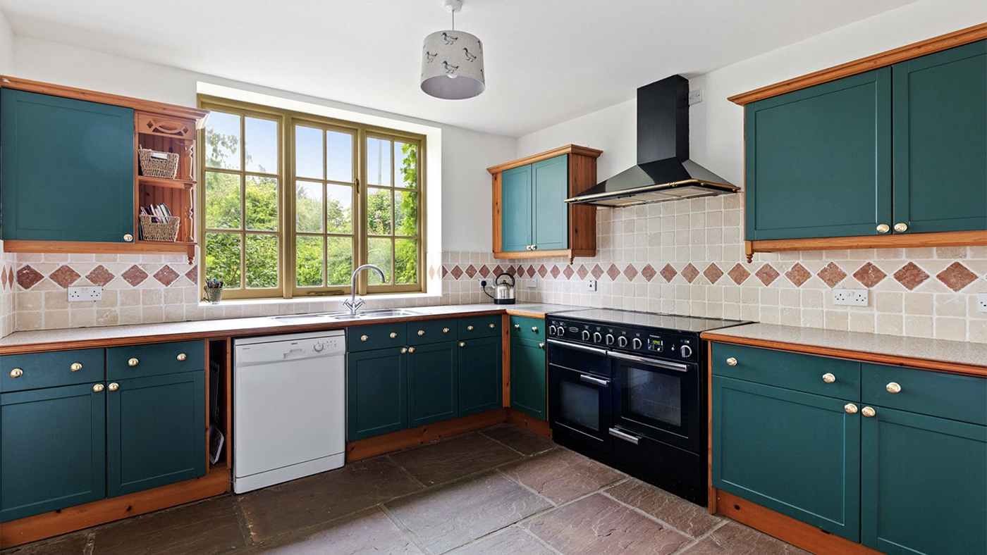 The country-style kitchen is spacious with a pantry. The kitchen sink is set under a window overlooking the garden to the south.